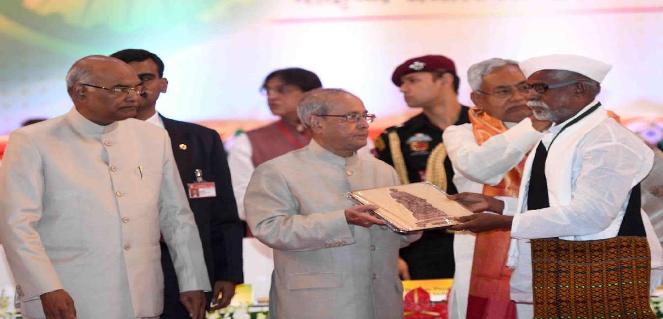 The President of India, Shri Pranab Mukherjee felicitating the Freedom Fighter on the occasion of Centenary of Mahatma Gandhi's Champaran Satyagraha, at Patna, in Bihar on April 17, 2017.