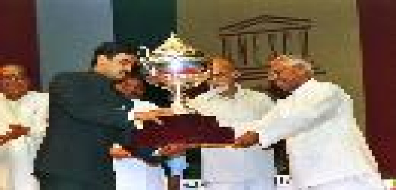 The President of India, Shri K R Narayanan presenting the Rajiv Gandhi National Sadbhavana Award to Ms Lata Mangeshkar at Jawahar Bhawan, Dr Rajendra Prasad Road in New Delhi on Aug 20, 1997