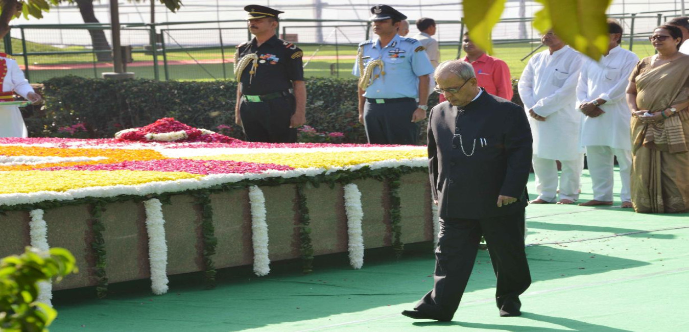 The President of India, Shri Pranab Mukherjee paying floral tributes at the Samadhi of Mahatma Gandhi on the occasion of his 146th Birth Anniversary, at Rajghat, in Delhi on October 02, 2015 .