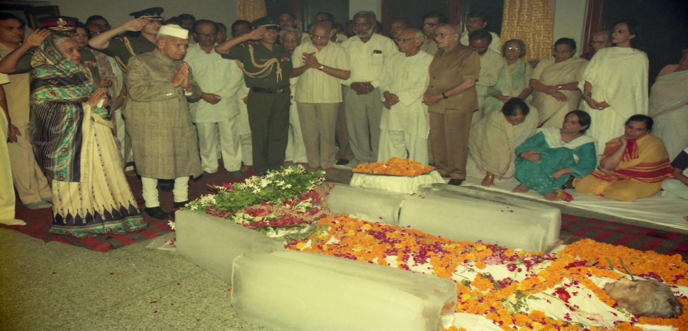 The President of India, Dr. Shankar Dayal Sharma paying floral tributes to Smt. Indira Gandhi on her 12th death Anniversary, at 1, Safdarjung Road in New Delhi on October 31, 1996.