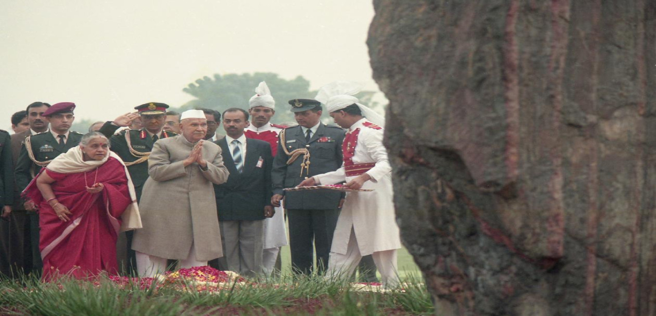 The President of India, Dr. Shankar Dayal Sharma paying floral tributes at the Samadhi of late Smt. Indira Gandhi, on her birth anniversary, at Shakti Sthal in New Delhi on November 19, 1996.