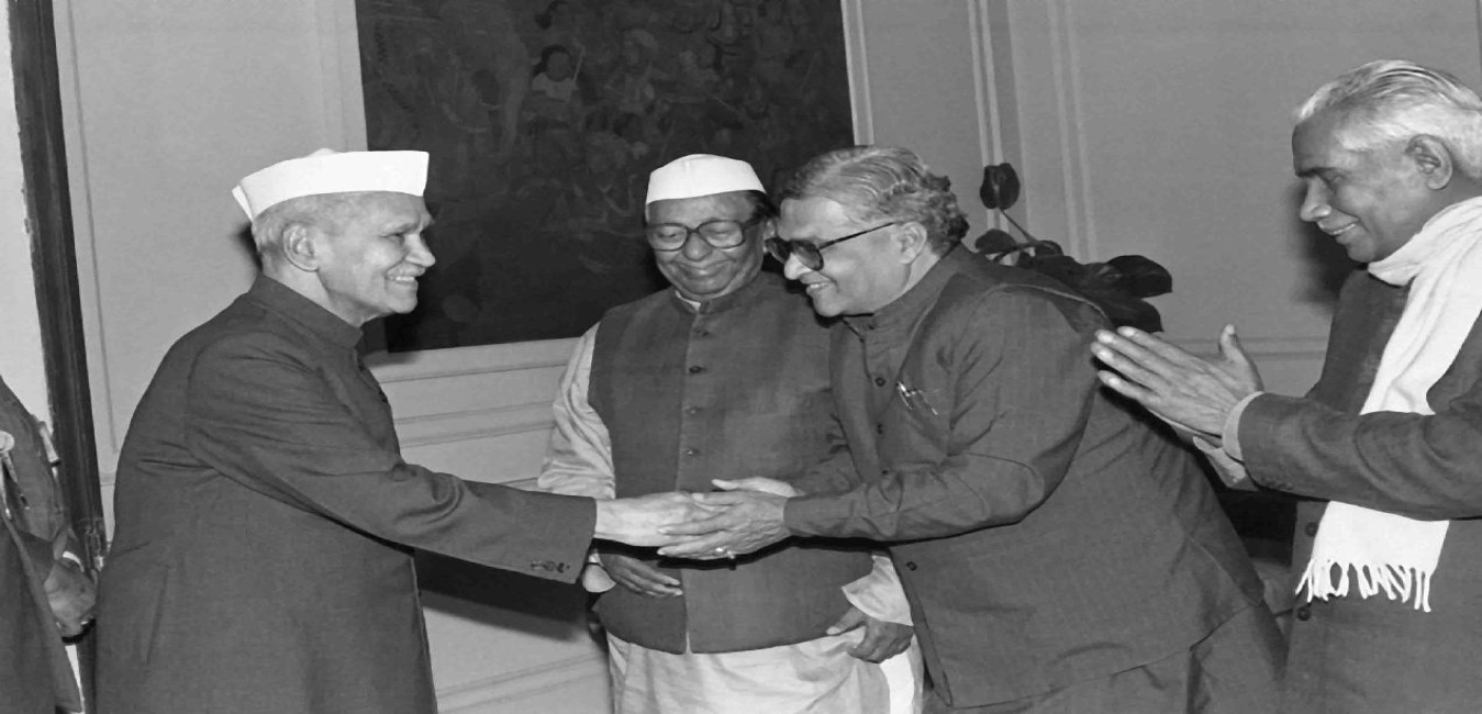 The President of India, Dr. Shankar Dayal Sharma receiving new year Greetings from the Vice President, Shri K.R. Narayanan, the Prime Minister, Shri P.V. Narasimha Rao and other dignitaries, at Rashtrapati Bhavan in New Delhi on January 01, 1994.