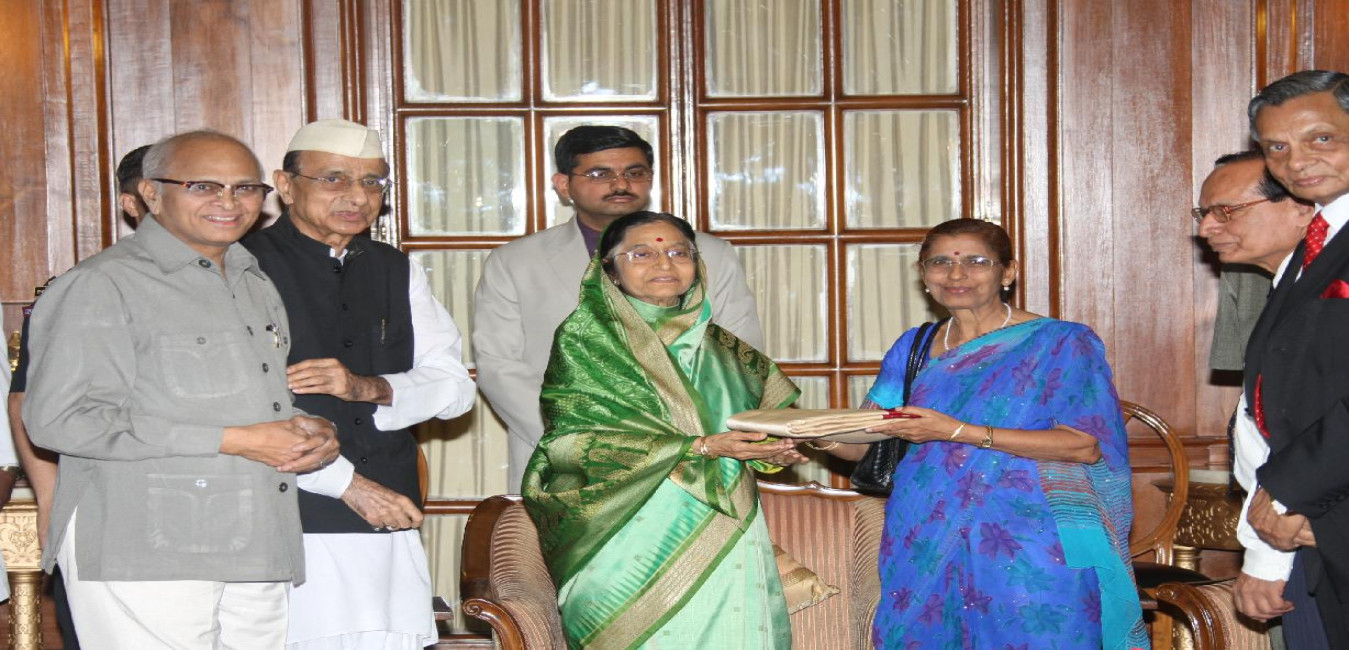 The President of India, Smt Pratibha Devisingh Patil receiving a Book by Dr Bhishma Narain Singh and others at the Rashtrapati Bhavan in New Delhi on July 10, 2008