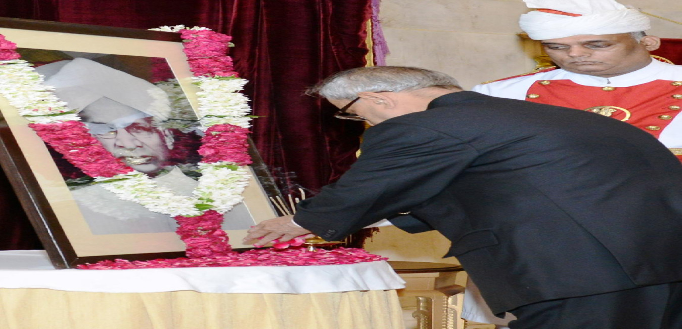 The President of India, Shri Pranab Mukherjee paying floral tributes at the Portrait of the Former President of India, Late Dr Sarvepalli Radhakrishnan on occasion of his Birth Anniversary at Rashtrapati Bhavan in New Delhi on Sep 05, 2014