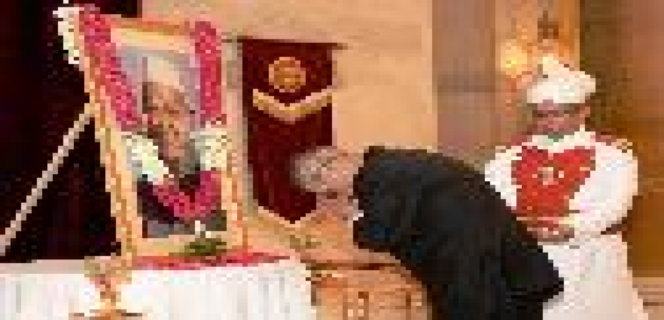 The President of India, Shri Pranab Mukherjee paying floral tributes at the Portrait of the Former President of India, Dr Shanker Dayal Sharma on the occasion of his Birth Anniversary at Rashtrapati Bhavan in New Delhi on August 19, 2014