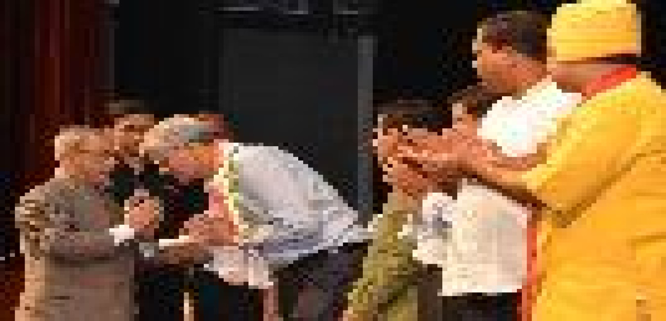 The President of India, Shri Pranab Mukherjee with the artists after witnessing a musical mono act on the Life of 'Soordas' by Shri Shekhar Sen, at Rashtrapati Bhavan Cultural Centre, in New Delhi on April 11, 2015.