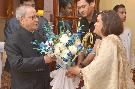 The President of India, Shri Pranab Mukherjee meeting with Shri J.L. Mukherjee and Smt. Purna Mukherjee alongwith their daughter Ms. Koyeli Mukherjee, at Rashtrapati Bhavan, in New Delhi on November 12, 2015.