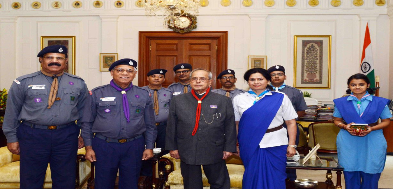 The Chief National Commissioner, Shri BI Nagarale with other members from Bharat Scouts & Guides (National Headquarters), pinning Bharat Scouts & Guides Flag sticker to the President of India, Shri Pranab Mukherjee on the occasion of Bharat Scouts & Guides Foundation Day, at Rashtrapati Bhavan on November 20, 2015.