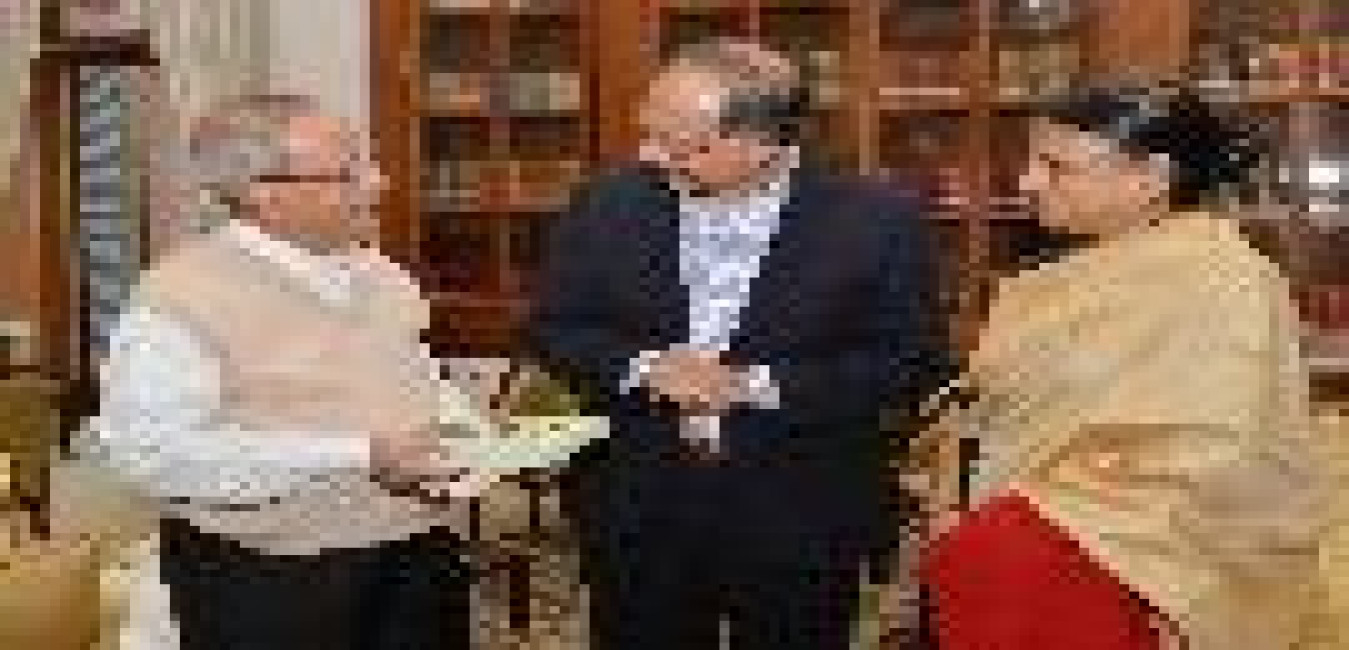 The President of India, Shri Pranab Mukherjee meeting with Shri Sujan R. Chinioy, Ambassador of India to Japan, at Rashtrapati Bhavan on December 14, 2015.