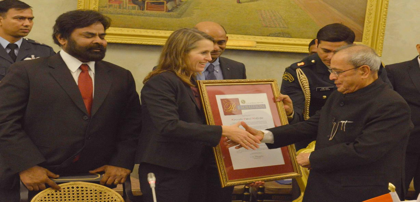 The President of India, Shri Pranab Mukherjee receiving Garwood Award for 'Outstanding Global Leader in Open Innovation' from UC Berkeley Haas School of Business, at Rashtrapati Bhavan on December 17, 2015.