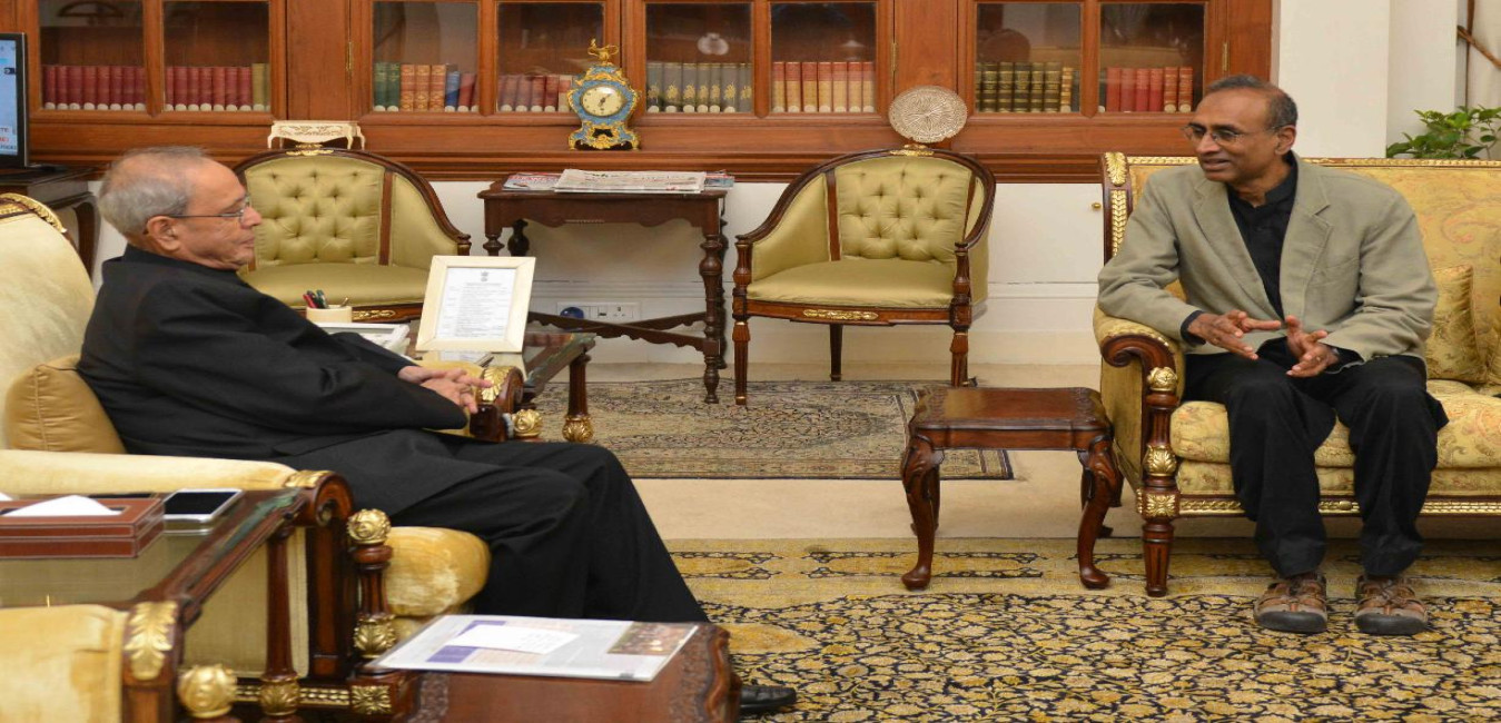 The President of India, Shri Pranab Mukherjee meeting with Prof. Sir Venkataraman Ramakrishnan, Nobel Laureate & President, The Royal Society, London along with Prof. Raghavendra Gadgkar, President Indian National Science Acamemy, at Rashtrapati Bhavan on January 08, 2016.