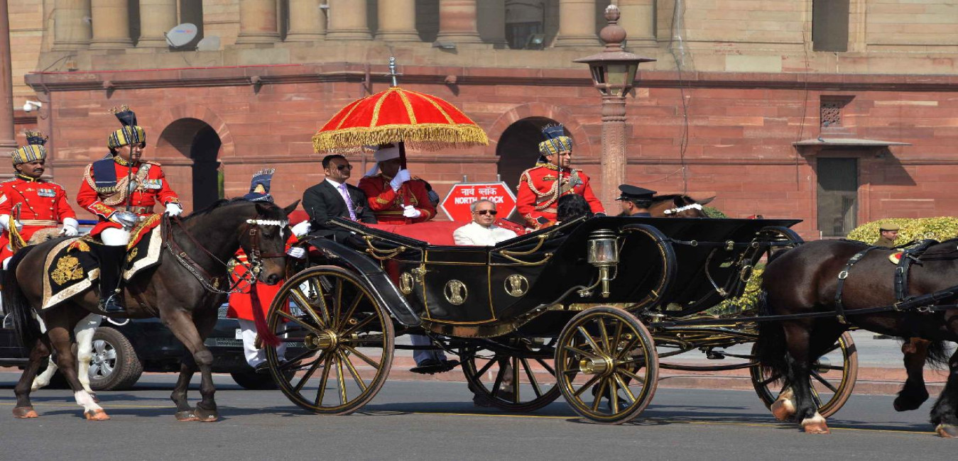The President of India, Shri Pranab Mukherjee leaving Forecourt for Central Hall of Parliament to deliver his address to both the Houses of Parliament in New Delhi on February 23, 2016.