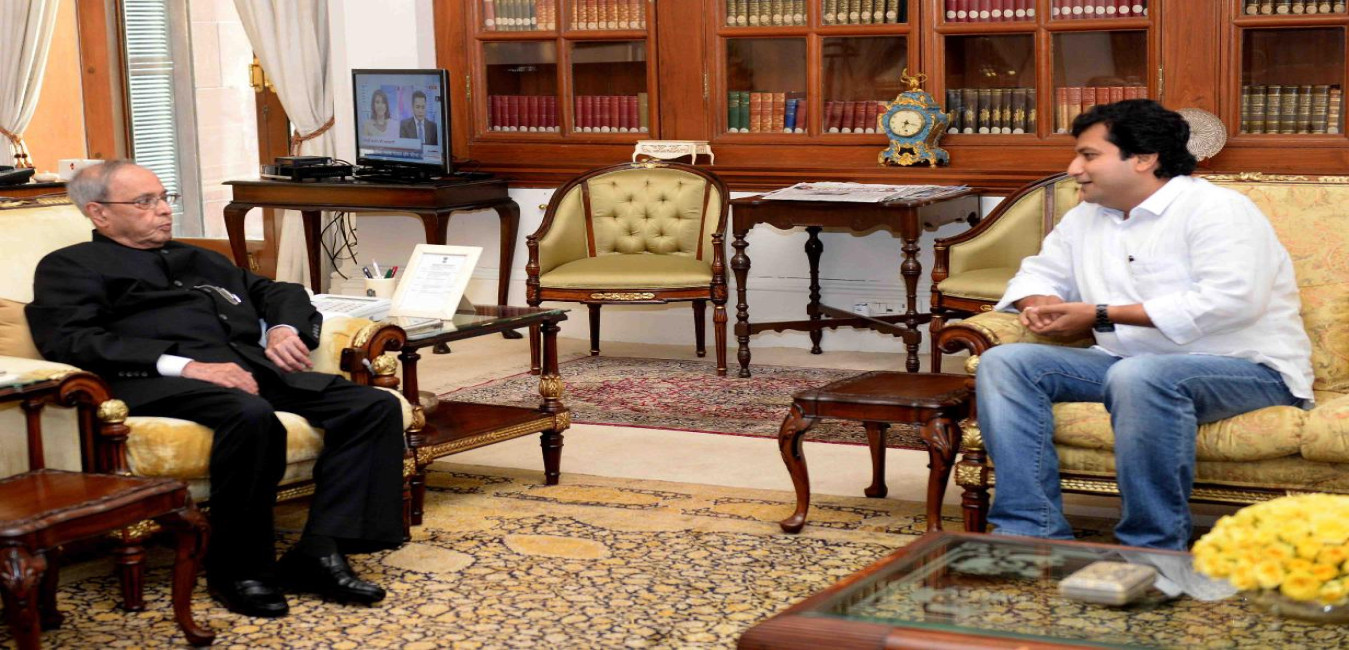 The President of India, Shri Pranab Mukherjee meeting with Shri Prashant Nandi alongwith his wife Smt. Usha Nandi and brother Shri Pradipto Nandi from Siliguri, at Rashtrapati Bhavan on May 31, 2016.