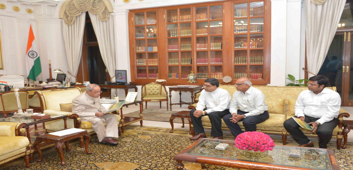 The President of India, Shri Pranab Mukherjee receiving the books ''Martyr and Freedom Fighter'' and ''Biography of Swami Kuvalyananda'' from Shri P.H. Parekh alongwith Shri Subodh Tiwari, Secretary, Kivalyadhama Shriman Madhava Yoga Mandir Samiti Lonavala, at Rashtrapati Bhavan on June 30, 2016.