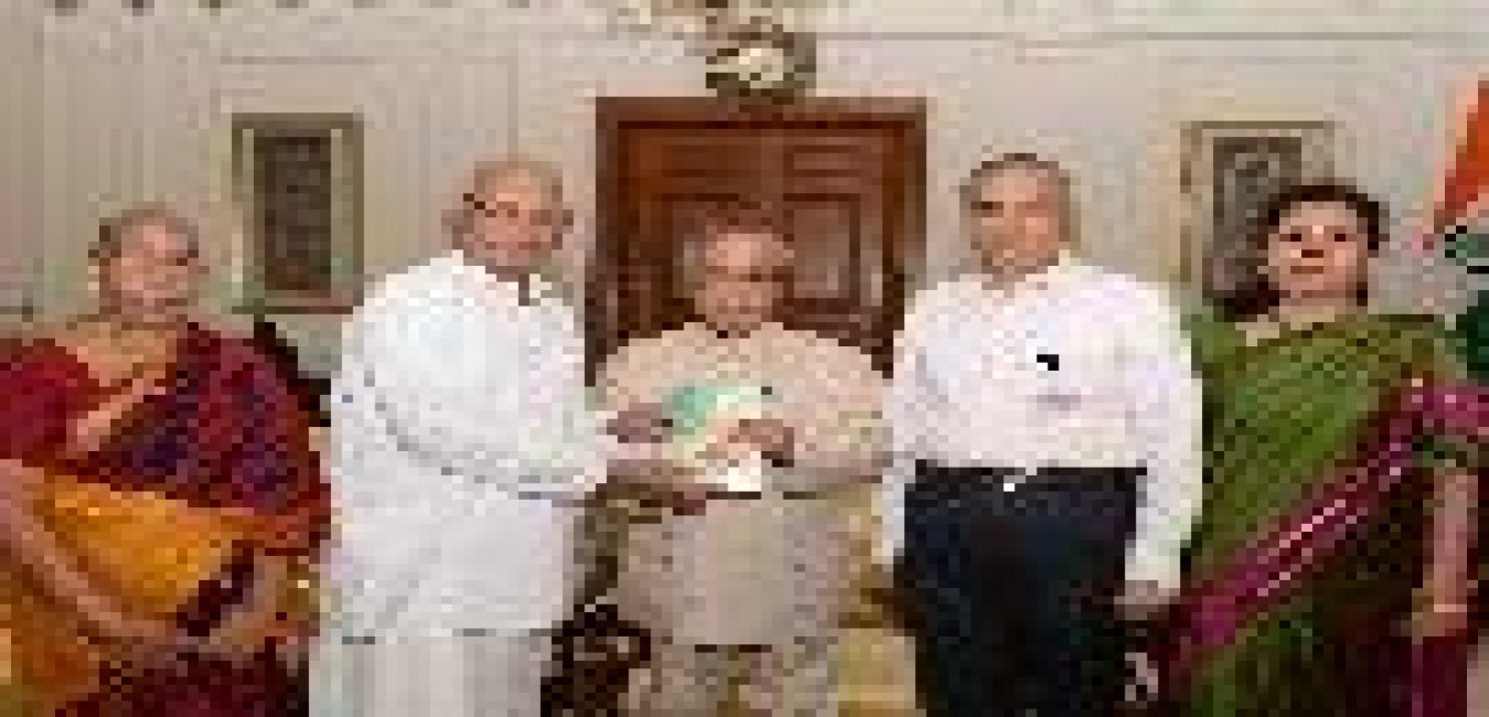 The President of India, Shri Pranab Mukherjee receiving a copy of the book ''Swami Vivekananda: Musician and Musicologist'' from Shri P.S. Mani alongwith his wife and daughter from Chennai, at Rashtrapati Bhavan on July 29, 2016.
