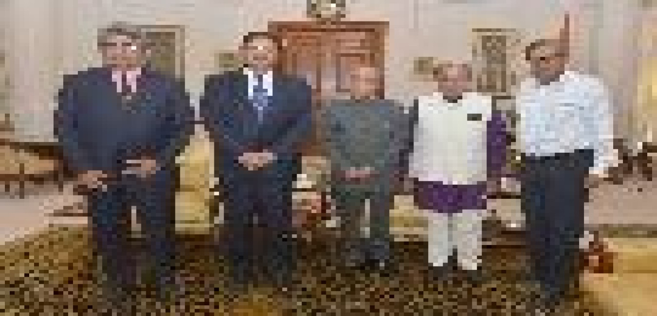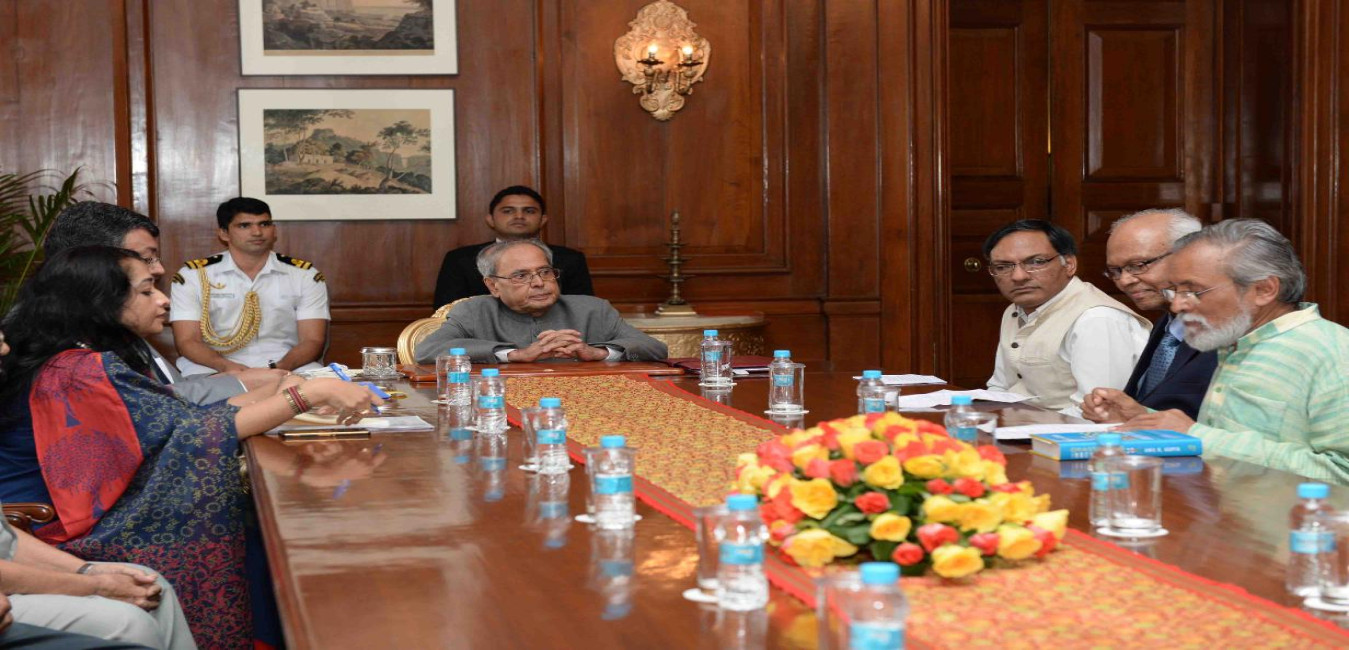 The President of India, Shri Pranab Mukherjee meeting with Shri N.K. Singh, EX- MP (RS) & Chairman alongwith Shri Urijit Patel, Shri Sumit Bose and Shri Rathin Roy, Members, FRBM Review Committee, at Rashtrapati Bhavan on August 03, 2016.
