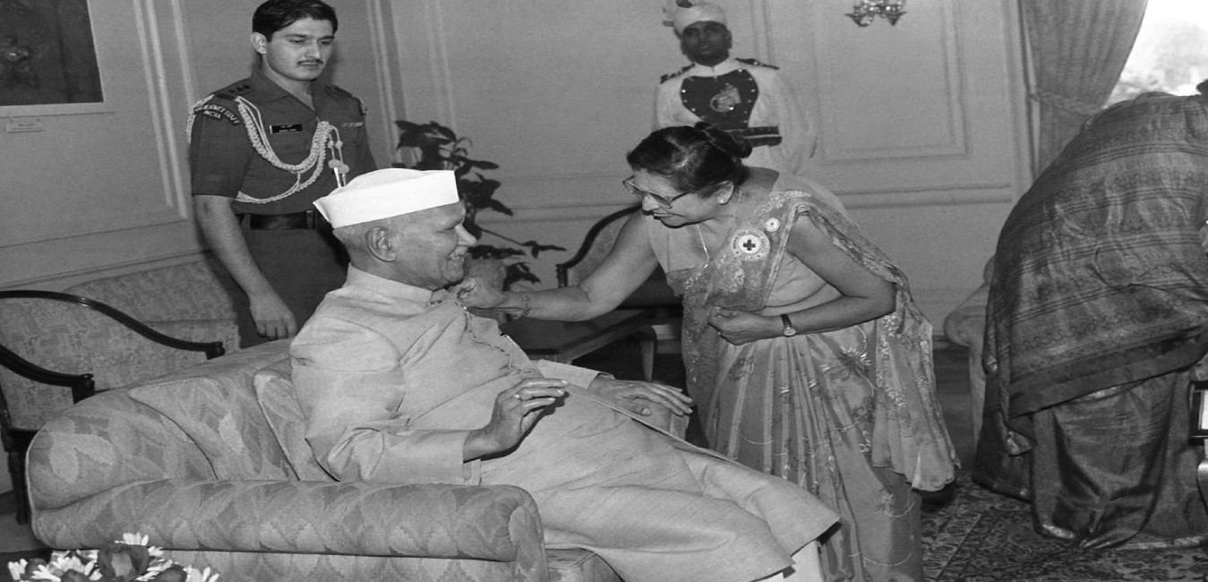 The President of India, Dr. Shankar Dayal Sharma being pinned a flag by Volunteers from the Indian Red Cross Society (Delhi Branch) on the occasion of their Flag Week at Rashtrapati Bhavan in New Delhi on November 01, 1995.