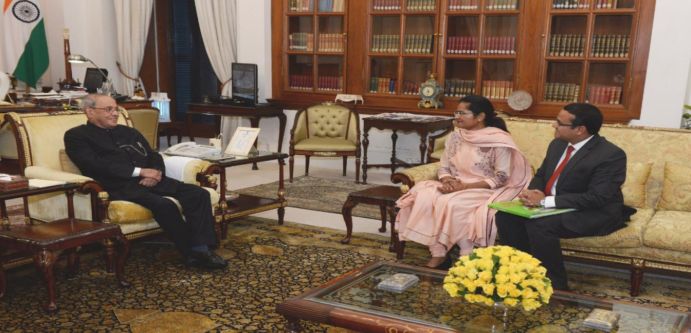 The President of India, Shri Pranab Mukherjee meeting with Smt. Aparna Kumar and Shri Sanjay Kumar, District Magistrate & Collector, Allahabad, at Rashtrapati Bhavan on August 17, 2016.