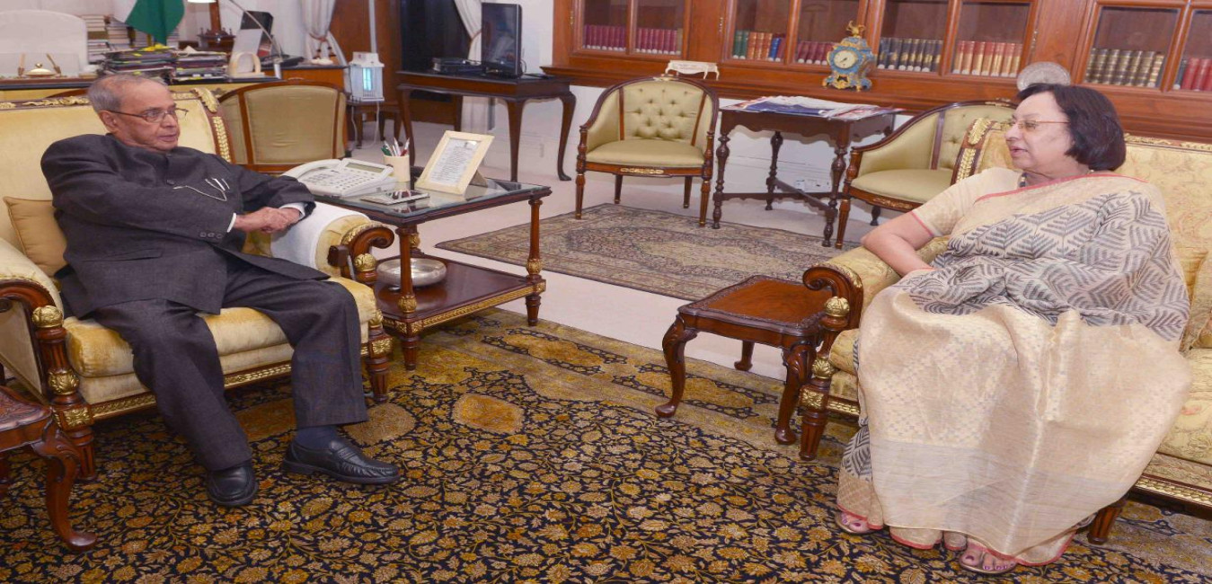 The President of India, Shri Pranab Mukherjee meeting with Dr. Najma Heptulla, Governor of Manipur, at Rashtrapati Bhavan on October 13, 2016.