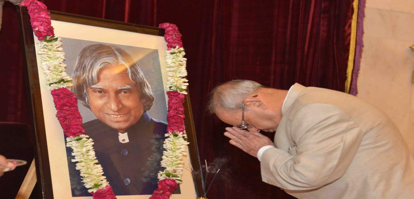 The President of India, Shri Pranab Mukherjee paying floral tributes at the portrait of the Former President of India, Dr. A.P.J. Abdul Kalam on the occasion of his Birth Anniversary, at Rashtrapati Bhavan on October 15, 2016.