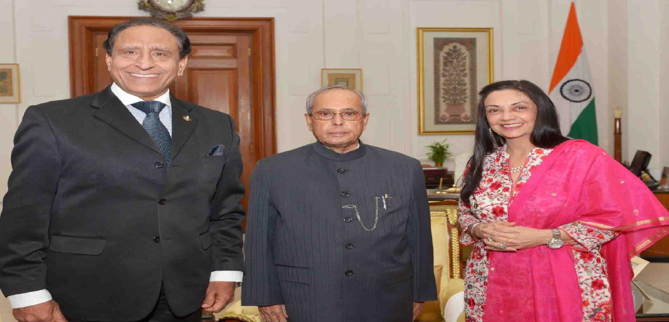 The President of India, Shri Pranab Mukherjee meeting with Brig Narender Kotwal, Head Department of Endocrinology, R&R Hospital along with his wife Dr. Sumedha Kotwal, at Rashtrapati Bhavan on February 11, 2017.