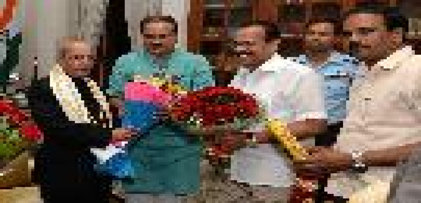 The President of India, Shri Pranab Mukherjee meeting with Shri Nepal Mahata, MLA West Bengal along with a delegation of Congress Leaders from Purulia, West Bengal, at Rashtrapati Bhavan on March 24, 2017.