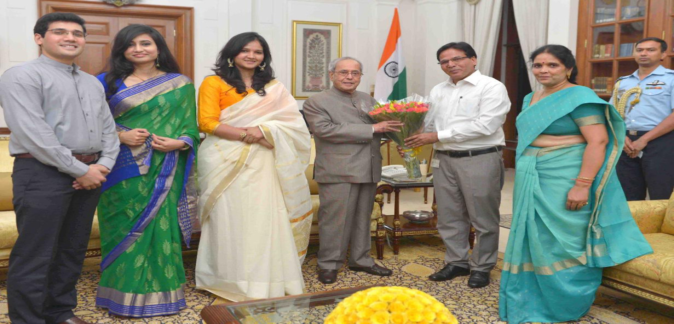 The President of India, Shri Pranab Mukherjee meeting with Shri Mukti Prasad Dhar alongwith his family members from Jangipur, at Rashtrapati Bhavan on May 30, 2017.