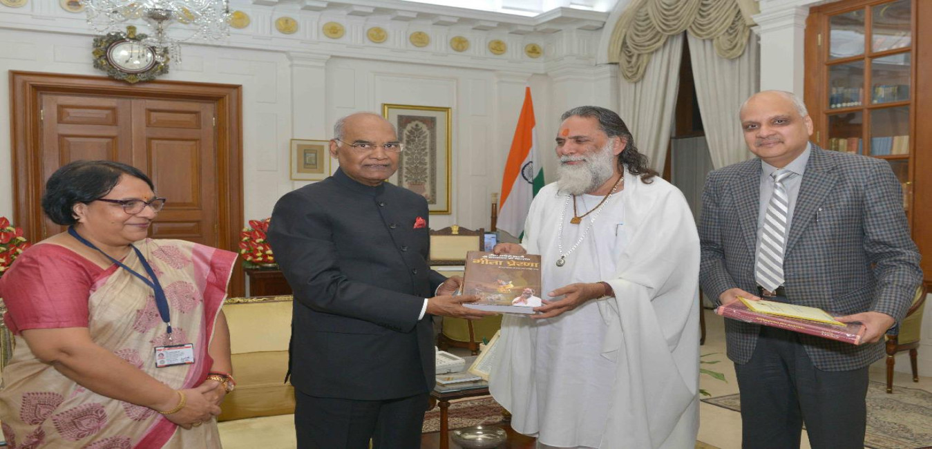 Swami Gyananand ji along with Shri Anand Mohan Sharan, Principal Secretary, Urban Local Bodies-cum-Principal Resident Commissioner, Govt. of Haryana and Smt. Sumedha Kataria, Deputy Commissioner, Kurukshetra meeting with the President of India, Shri Ram Nath Kovind, at Rashtrapati Bhavan on November 13, 2017.