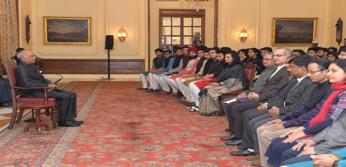 The President of India, Shri Ram Nath Kovind meeting with the students and teachers from Shaheed Sukhdev College of Business Studies, University of Delhi, participated in the Enactus World Cup-2017, at Rashtrapati Bhavan on December 21, 2017.