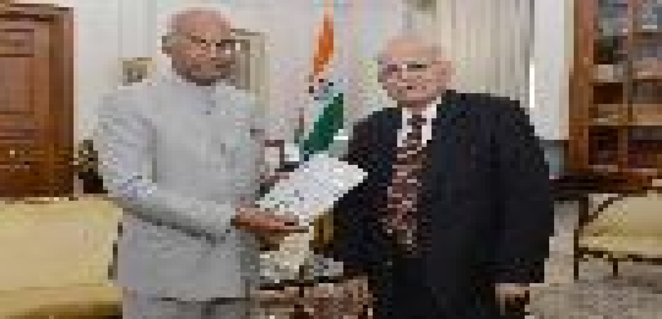 Shri S.K. Mishra, Padmabhushan Awardee and former Principal Secretary to the Prime Minister presents a copy of his book 'Flying in High Winds' to the President of India, Shri Ram Nath Kovind, at Rashtrapati Bhavan on July 02, 2018.