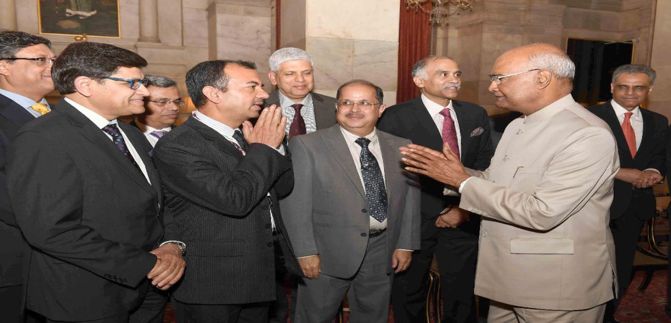 Shri Ajay Shriram, Chairman, CII Agro Tech 2018 along with Shri Sameer Gupta, Deputy Chairman, CII Northern Region, Shri Marut Sengupta, Deputy Director General, CII and Shri Ankur Singh Chauhan, Regional Director, CII, Northern Region meeting with the President of India, Shri Ram Nath Kovind, at Rashtrapati Bhavan on July 04, 2018.