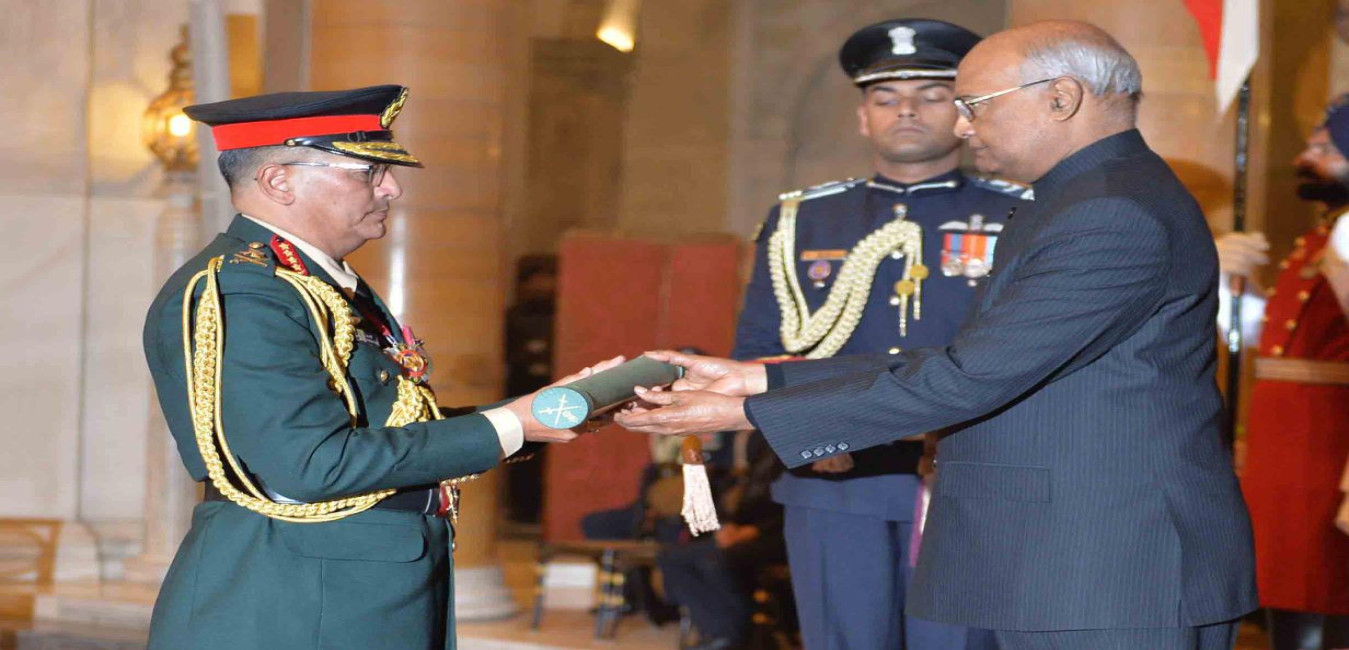 The President of India, Shri Ram Nath Kovind conferring the Honorary Rank of General of the Indian Army on Sukirtimaya Rashtradeep General Purna Chandra Thapa, Chief of the Army Staff, Nepalese Army, at Rashtrapati Bhavan on January 12, 2019.