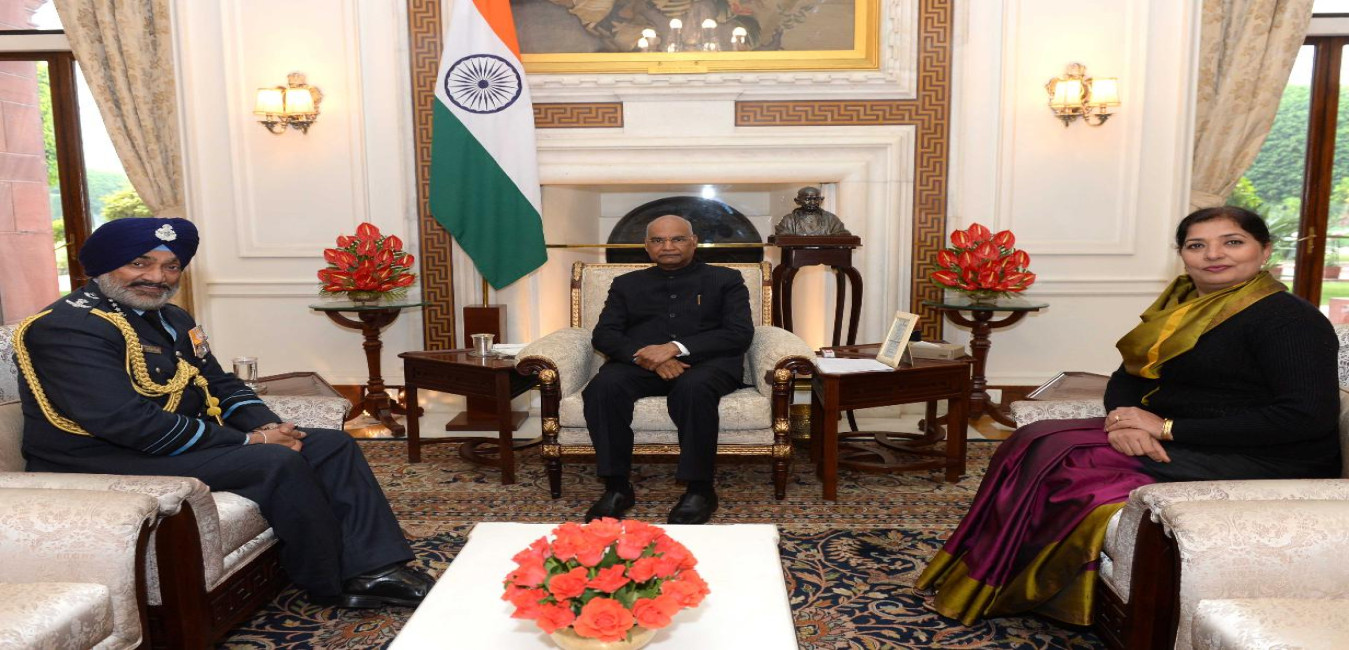 Air Marshal RKS Shera, ADC, AOC-in-C, HQ, Maintenance Command along with his wife Smt. Jaspreet Shera meeting with the President of India, Shri Ram Nath Kovind, at Rashtrapati Bhavan on December 16, 2019.