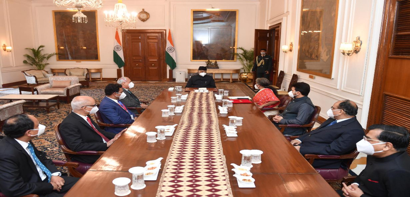 The Chief Minister of Puducherry, Shri V. Narayanasamy along with Ministers and MP from Puducherry calling on the President of India, Shri Ram Nath Kovind, at Rashtrapati Bhavan on February 10, 2021.