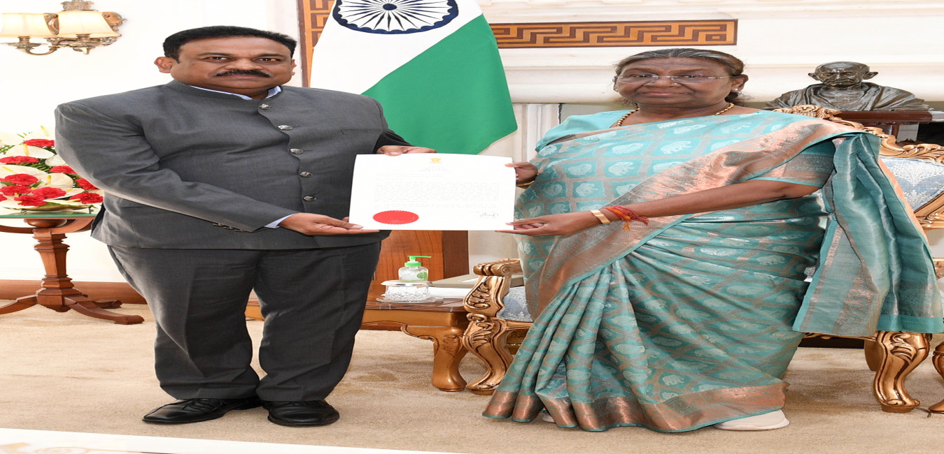The Ambassador-desginate of India to the Islamic Republic of Mauritania, Shri Naresh Kumar meeting with the President of India Smt Droupadi Murmu at Rashtrapati Bhavan on April 2, 2024.