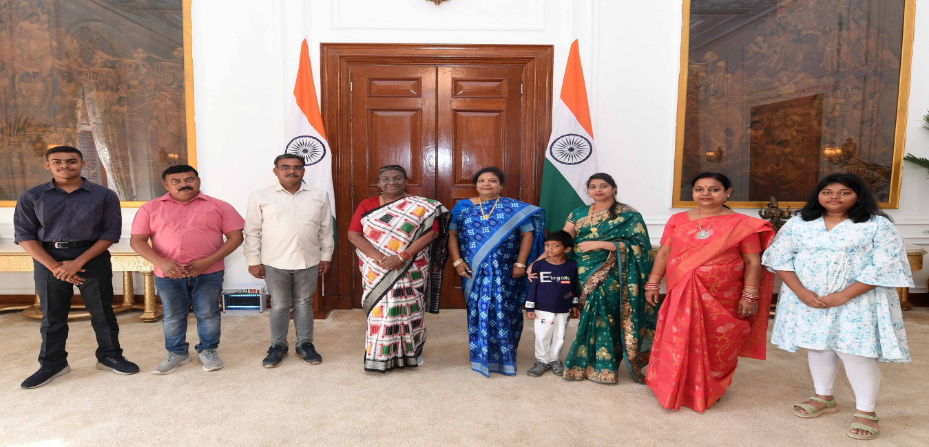 Shri Ritesh Kumar Athghara from Rairangpur along with others meeting with the President of India Smt Droupadi Murmu at Rashtrapati Bhavan on March 28, 2024.