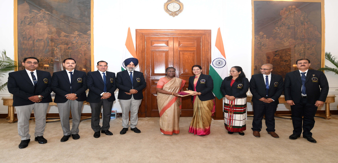 Lt Col (Dr.) GK Singh, Dermatologist, Base Hospital, Delhi Cantt along with others meeting with the President of India, Smt. Droupadi Murmu at Rashtrapati Bhavan on May 11, 2023