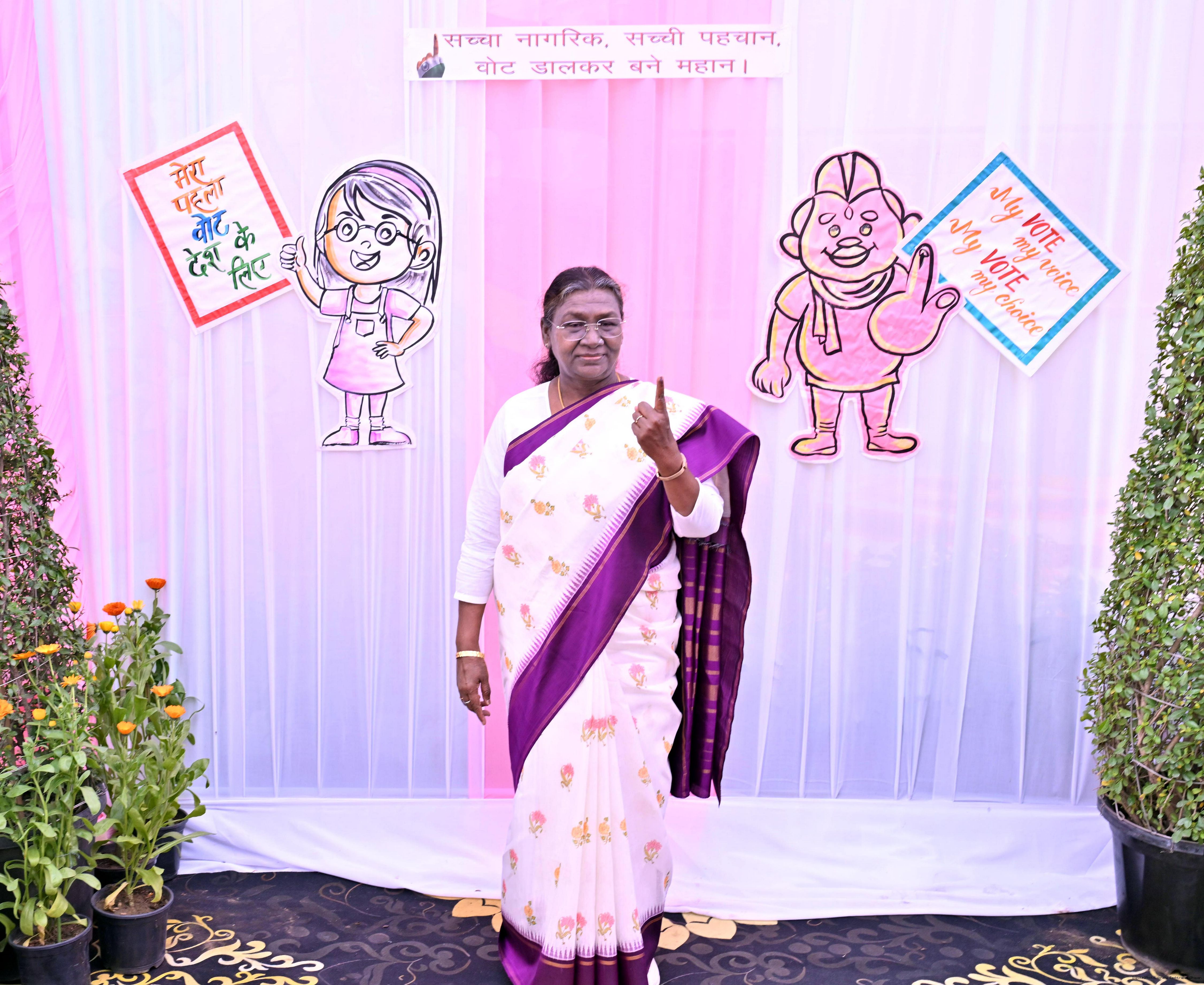 The President , Smt.Droupadi Murmu voted in the Delhi Legislative Assembly elections 2025 at the polling station in Dr. Rajendra Prasad Kendriya Vidyalaya inside Rashtrapati Bhavan complex in New Delhi on February 05, 2025.