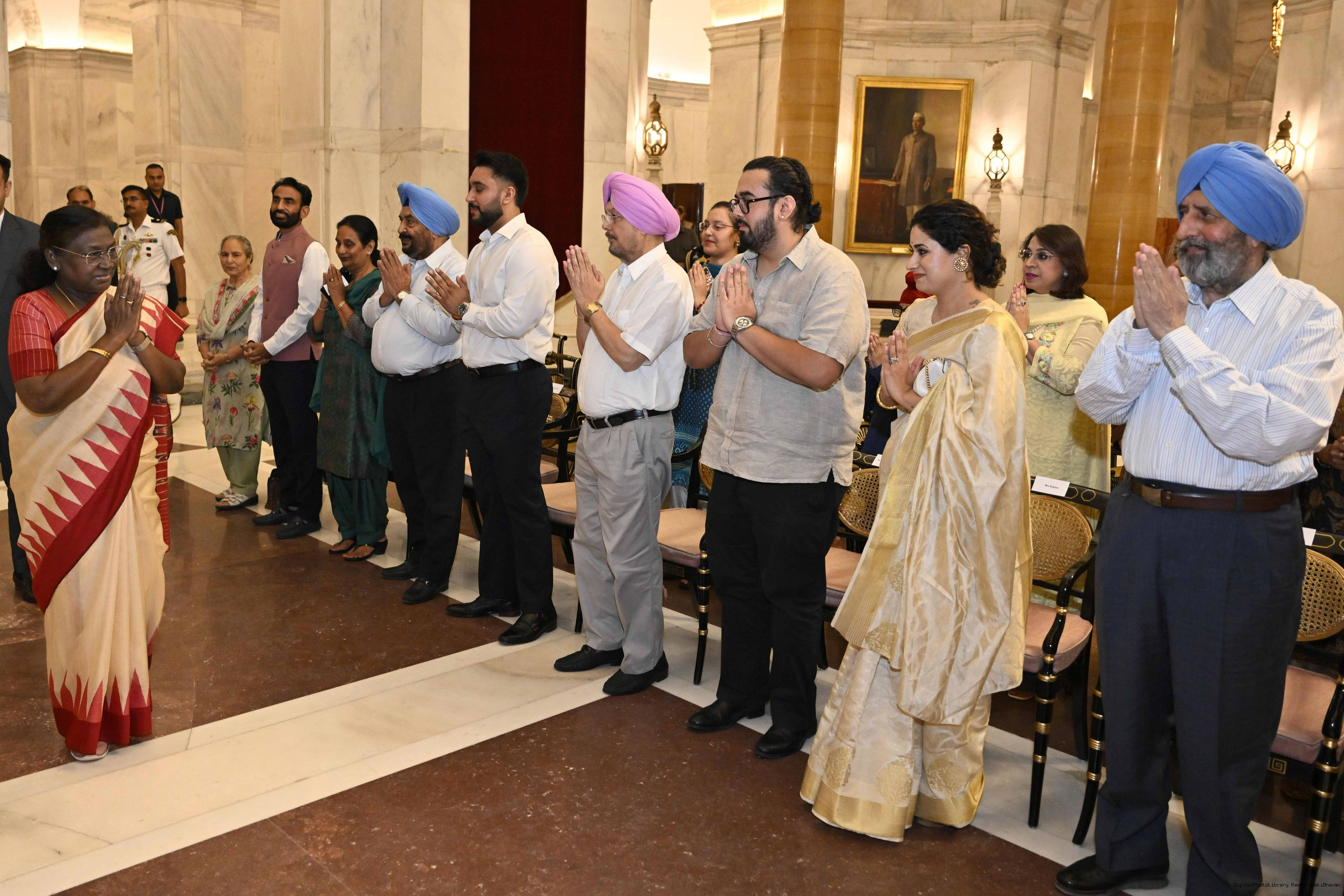 Shri Atul Jog, Sangathan Mantri, Akhil Bharatiya Vanvasi Kalyan Ashram along with others meeting with the President of India, Smt. Droupadi Murmu at Rashtrapati Bhavan on May May 5, 2025.