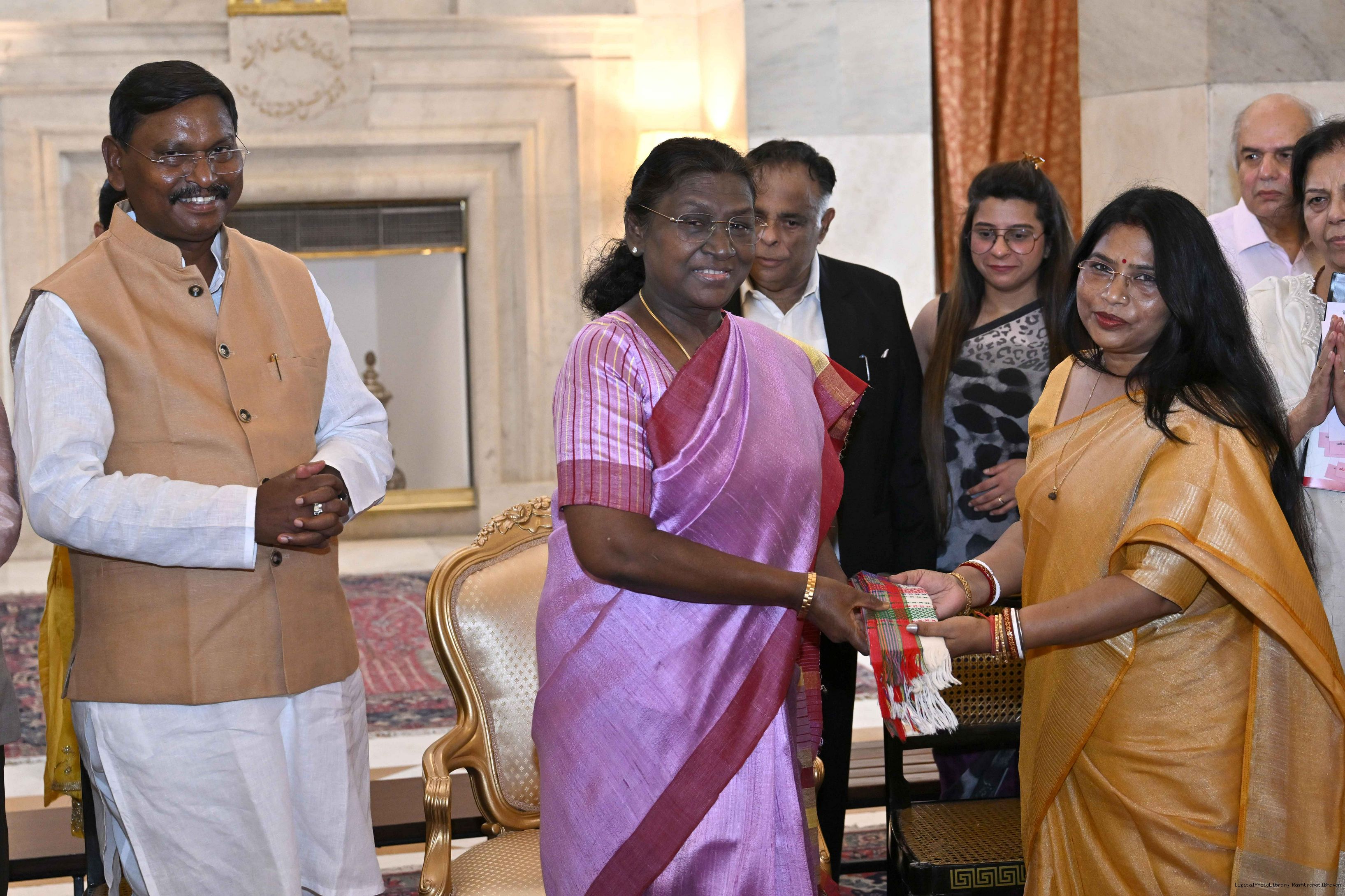 Dr. Anant Lal Murmu, Assistant Professor, Department of Civil Engineering, Netaji Subhas University of Technology, West Campus, New Delhi meeting with the President of India, Smt. Droupadi Murmu at Rashtrapati Bhavan on May May 5, 2025.