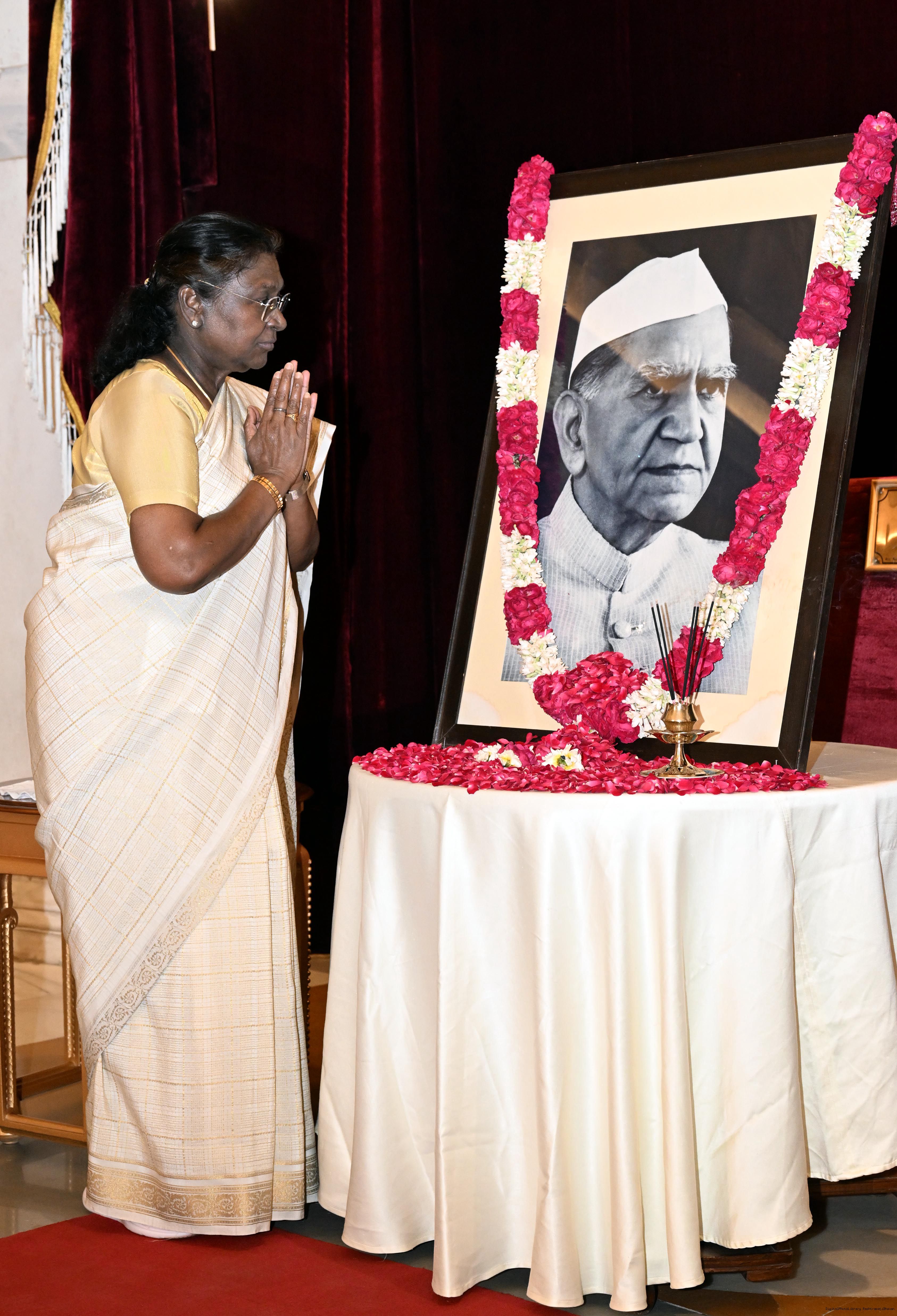 The President of India, Smt Droupadi Murmu paid floral tributes to Shri Fakhruddin Ali Ahmed, former President of India on his birth anniversary at Rashtrapati Bhavan on May 13, 2025.