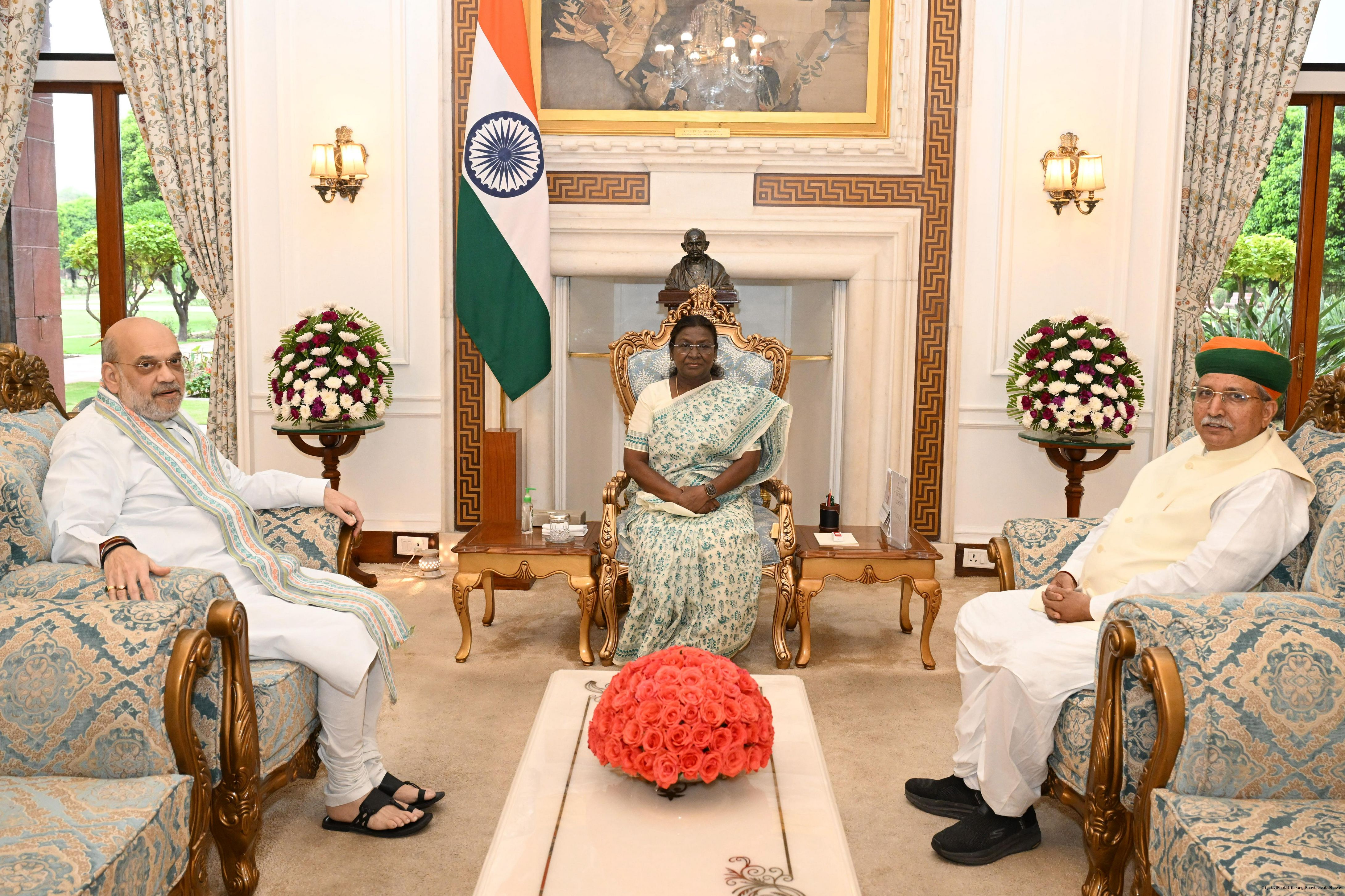 The Union Minister for Home Affairs and Cooperation, Shri Amit Shah and Minister of State (IC) for Law Justice and Minister of State for Parliamentary Affairs, Shri Arjun Ram Meghwal called on the President of India, Smt. Droupadi Murmu at Rashtrapati Bhavan on May 13, 2025.