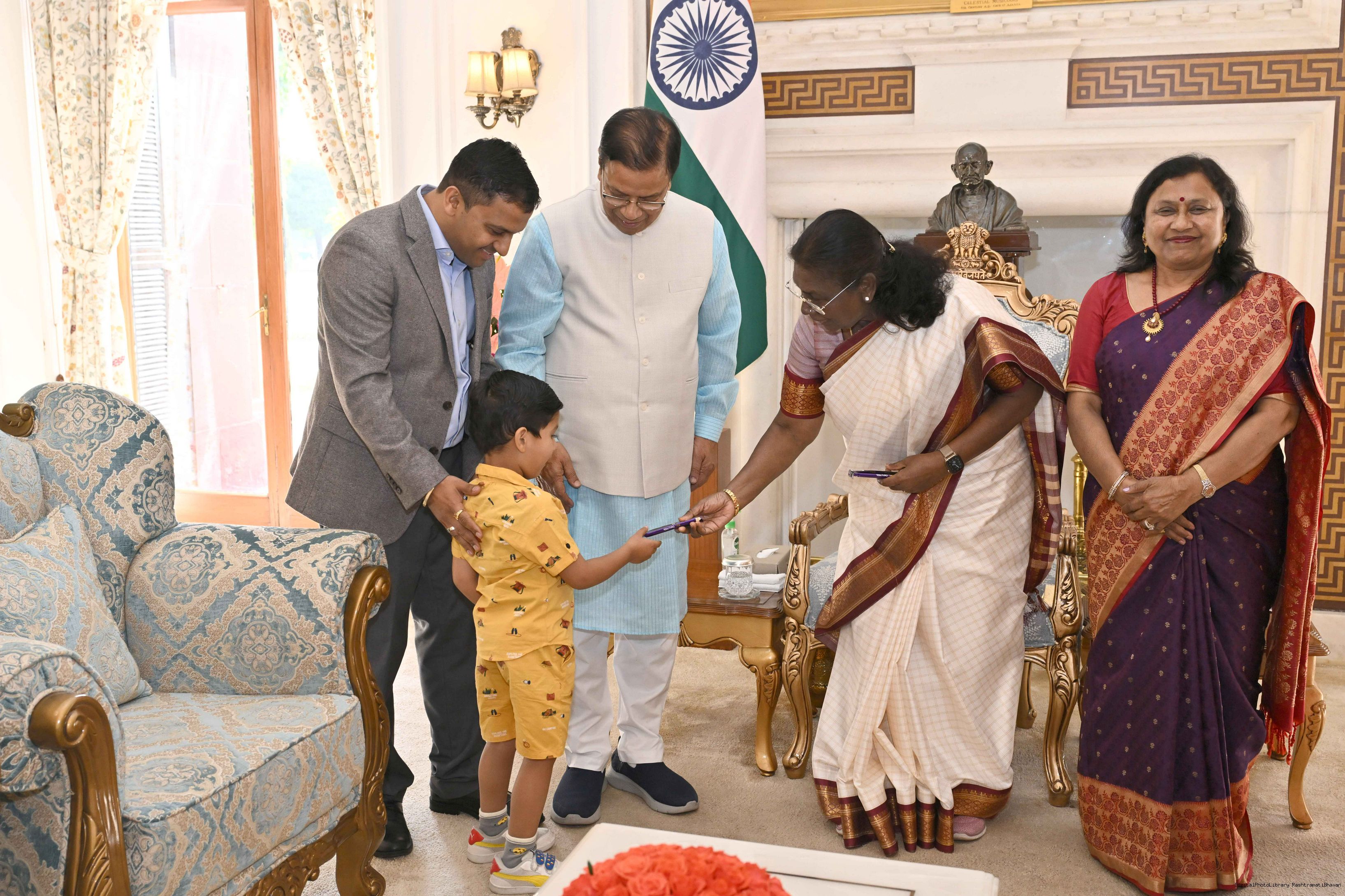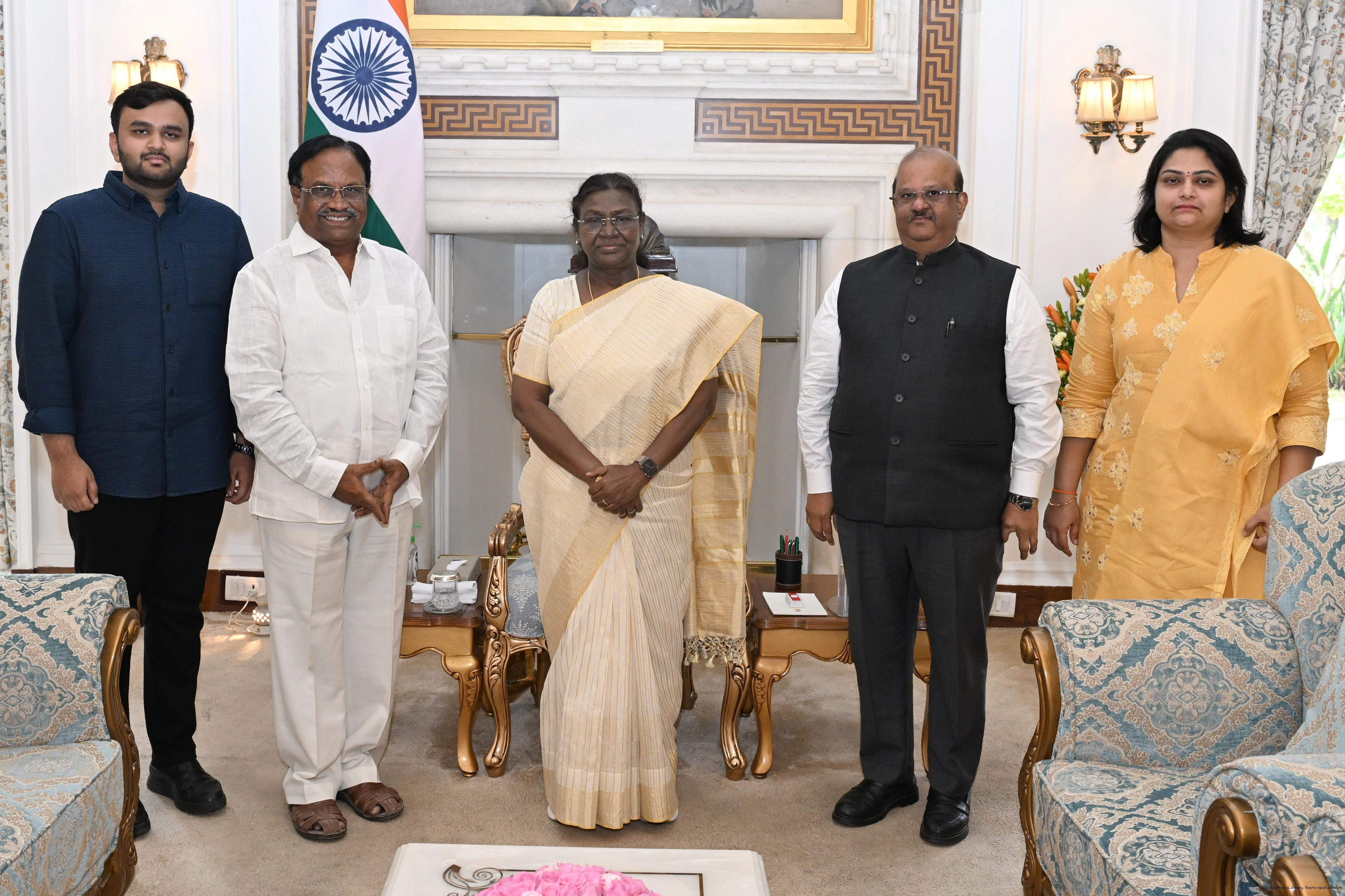 Shri V. Vijaya Raghava Reddy from Rairangpur, Odisha along with Shri S. Aarathi and Shri S. Vijay Adhithya meeting with the President of India, Smt. Droupadi Murmu at Rashtrapati Bhavan on May 21, 2025.