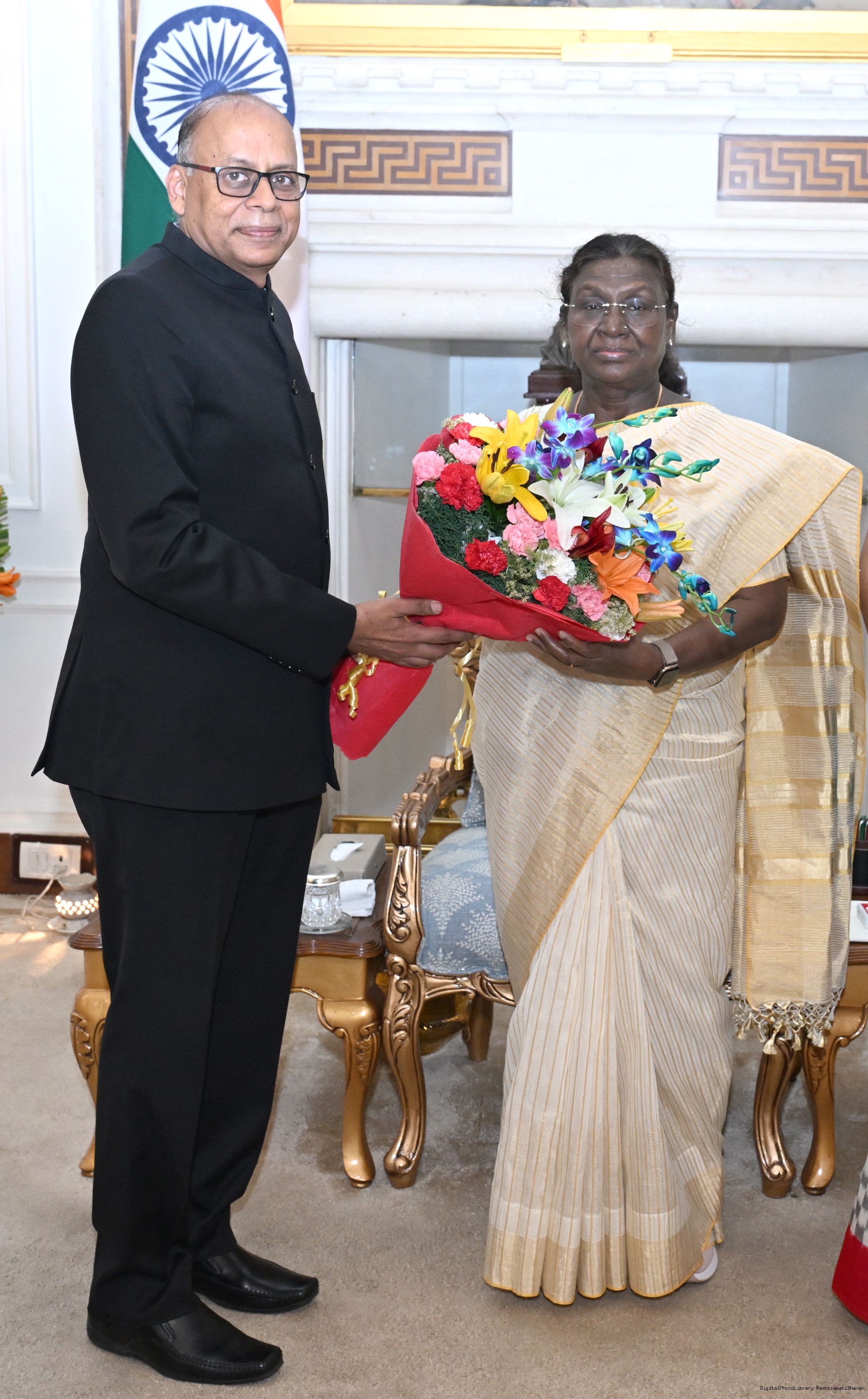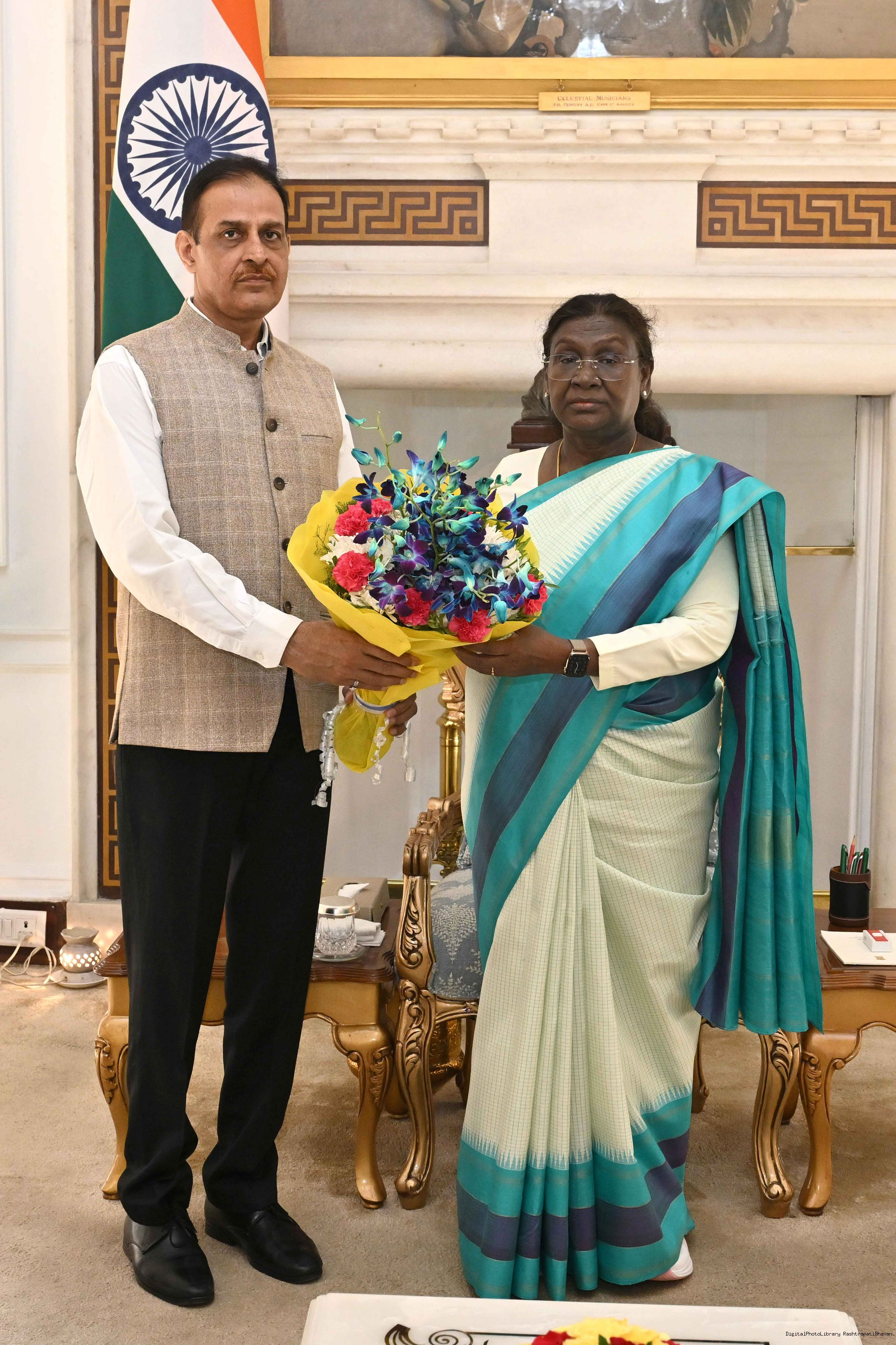 Dr. Ajay Kumar, Chairman, Union Public Service Commission (UPSC) along with spouse Smt. Veenja Kumar meeting with the President of India, Smt. Droupadi Murmu at Rashtrapati Bhavan on May 21, 2025.