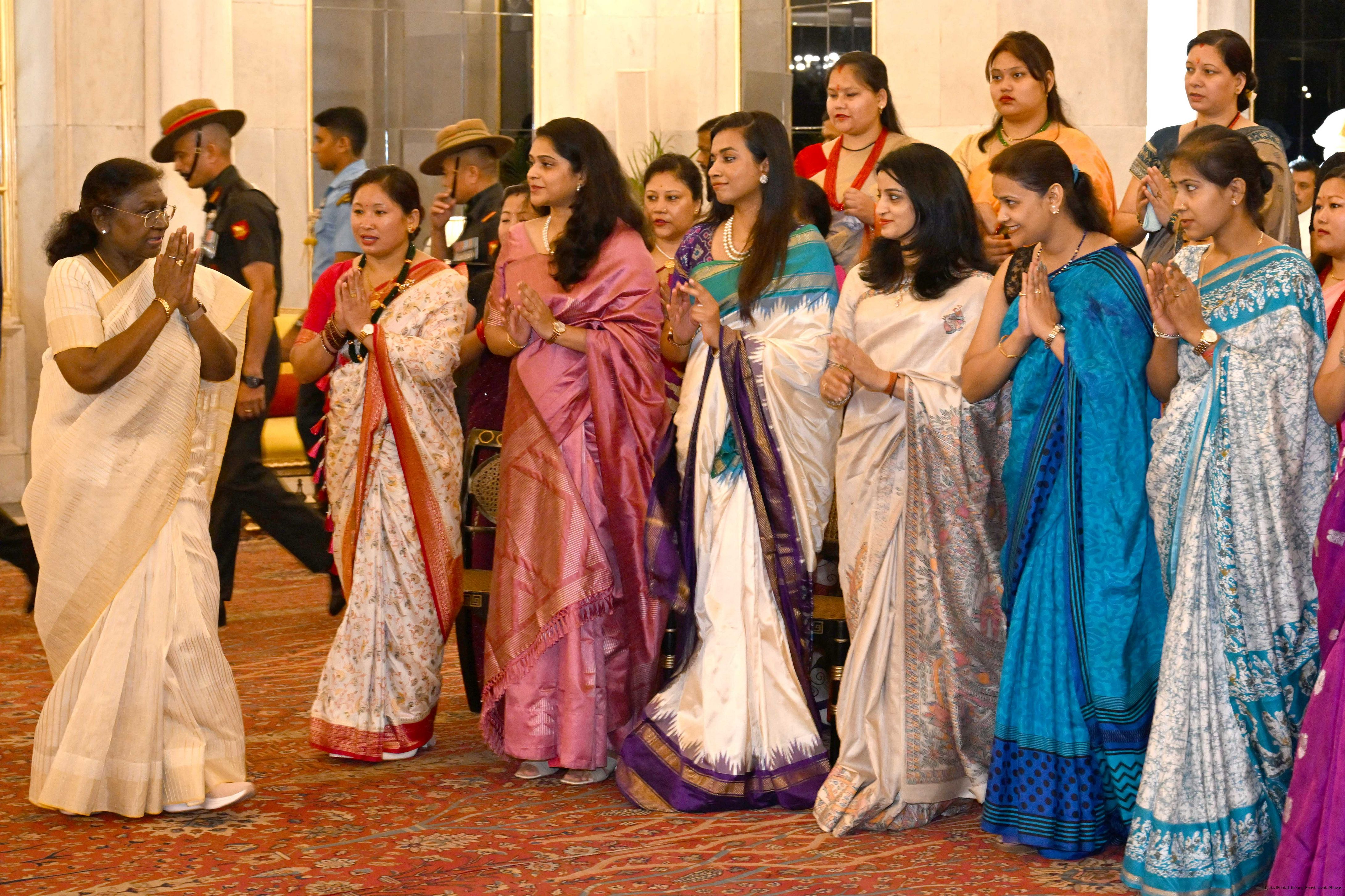 Ms. Sarita Agrawal from Rairangpur, Odisha aling with shri Dinesh Mishra and others meeting with the President of India, Smt. Droupadi Murmu at Rashtrapati Bhavan on May 15, 2025.