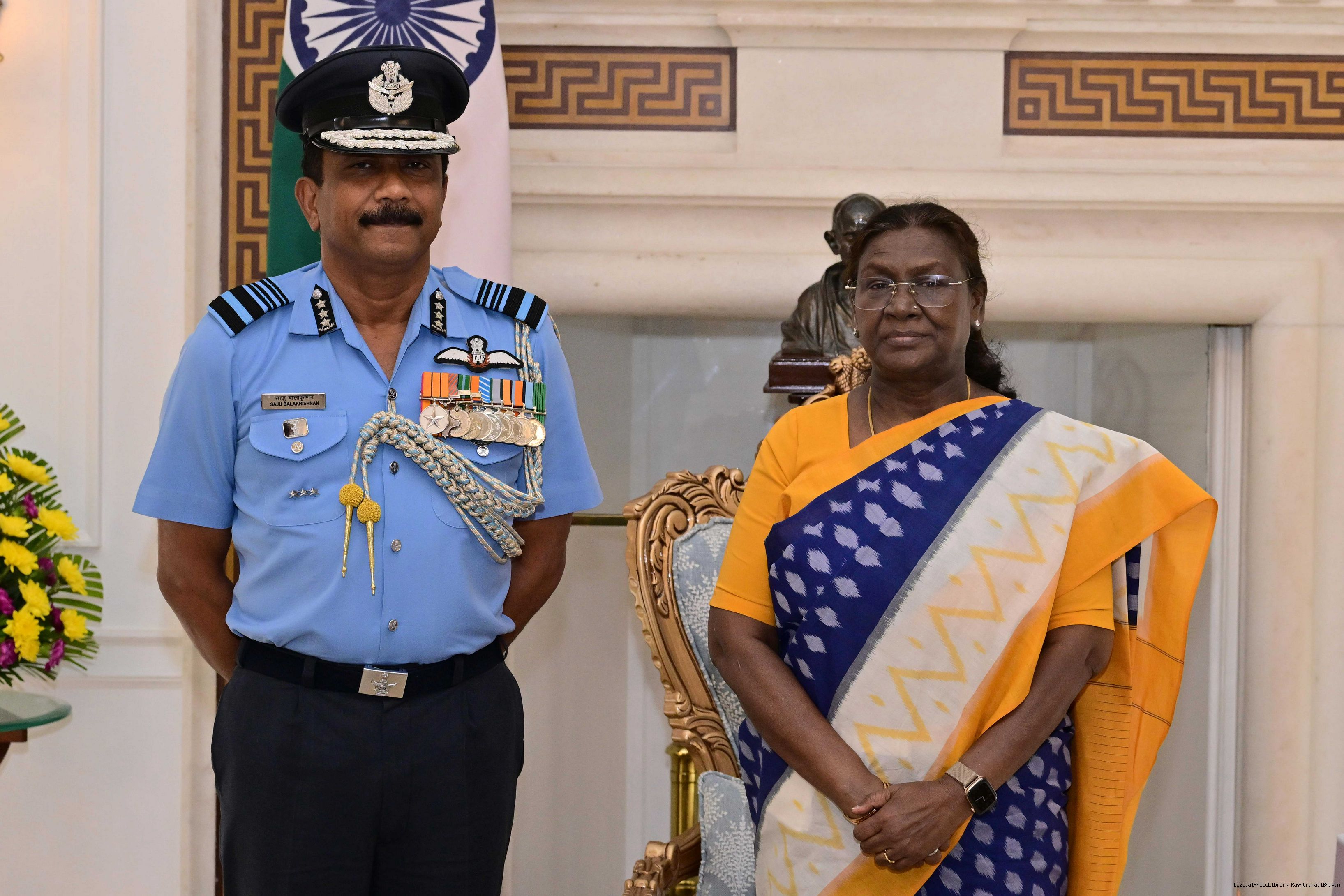 Air Marshal Saju Balakrishnan, PVSM, AVSM, VM, CINCAN meeting with the President of India, Smt. Droupadi Murmu at Rashtrapati Bhavan on May 26, 2025.