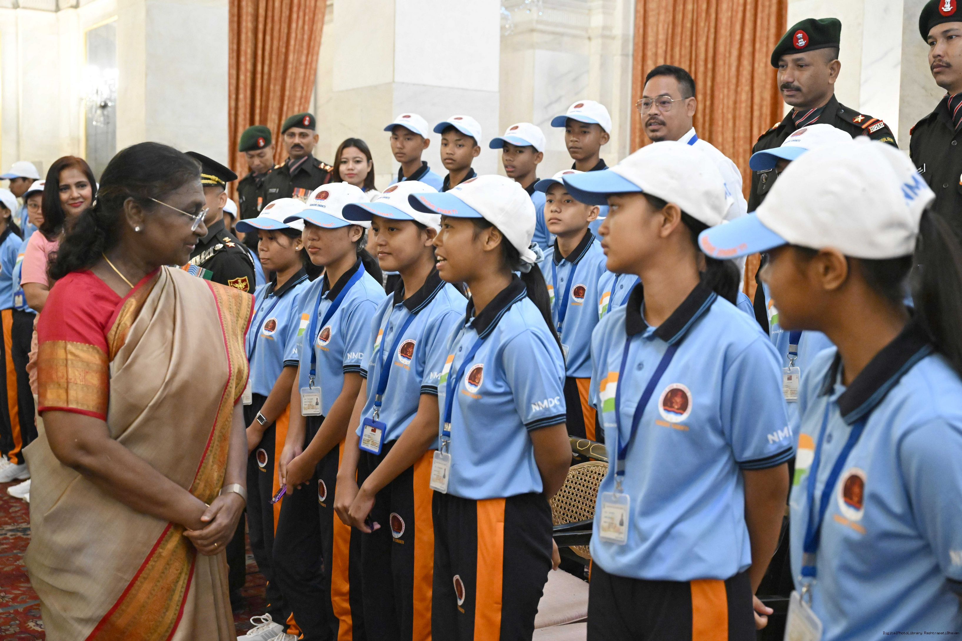 The President of India, Smt Droupadi Murmu met and posing a group photograph with 32 children from Local Tribes of Andaman Nicobar Islands (ANI) along with 11 defence personnel on the occasion of Independence Day Celebrations, 2025 at Rashtrapati Bhavan on August 14, 2025.