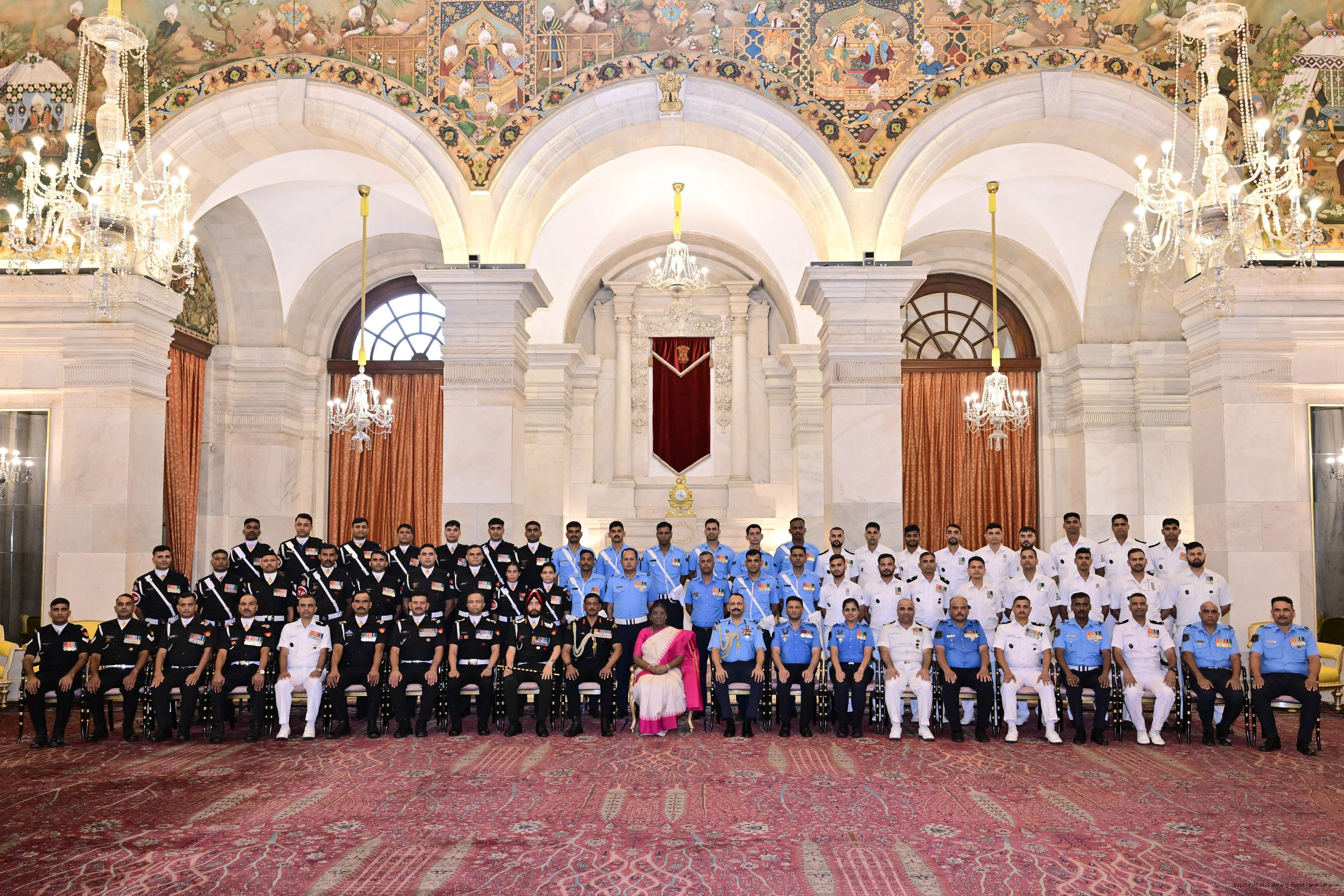 The President of India, Smt Droupadi Murmu posing a group photograph with the Tri-Services provost personnel at Rashtrapati Bhavan on August 15, 2025.