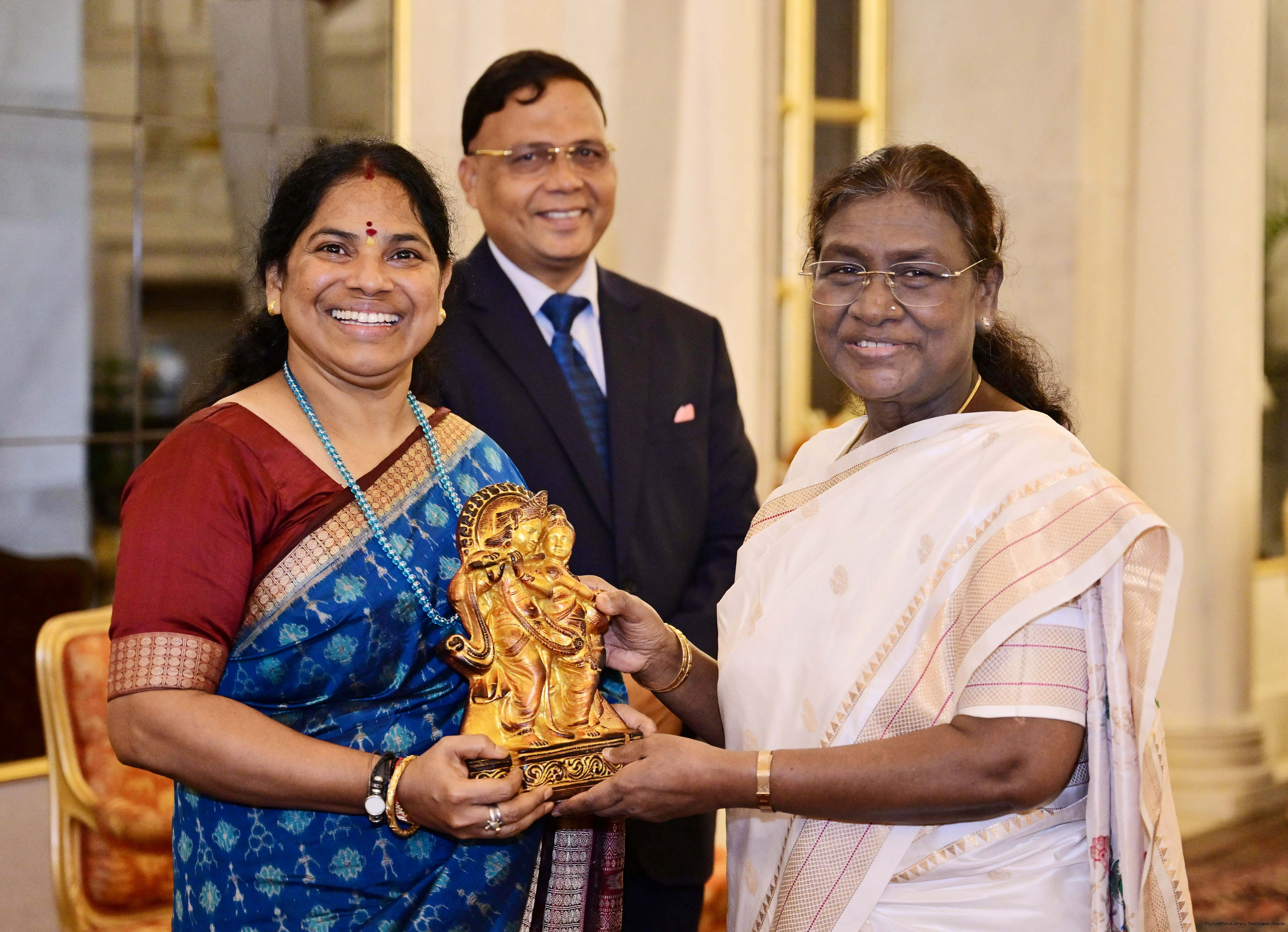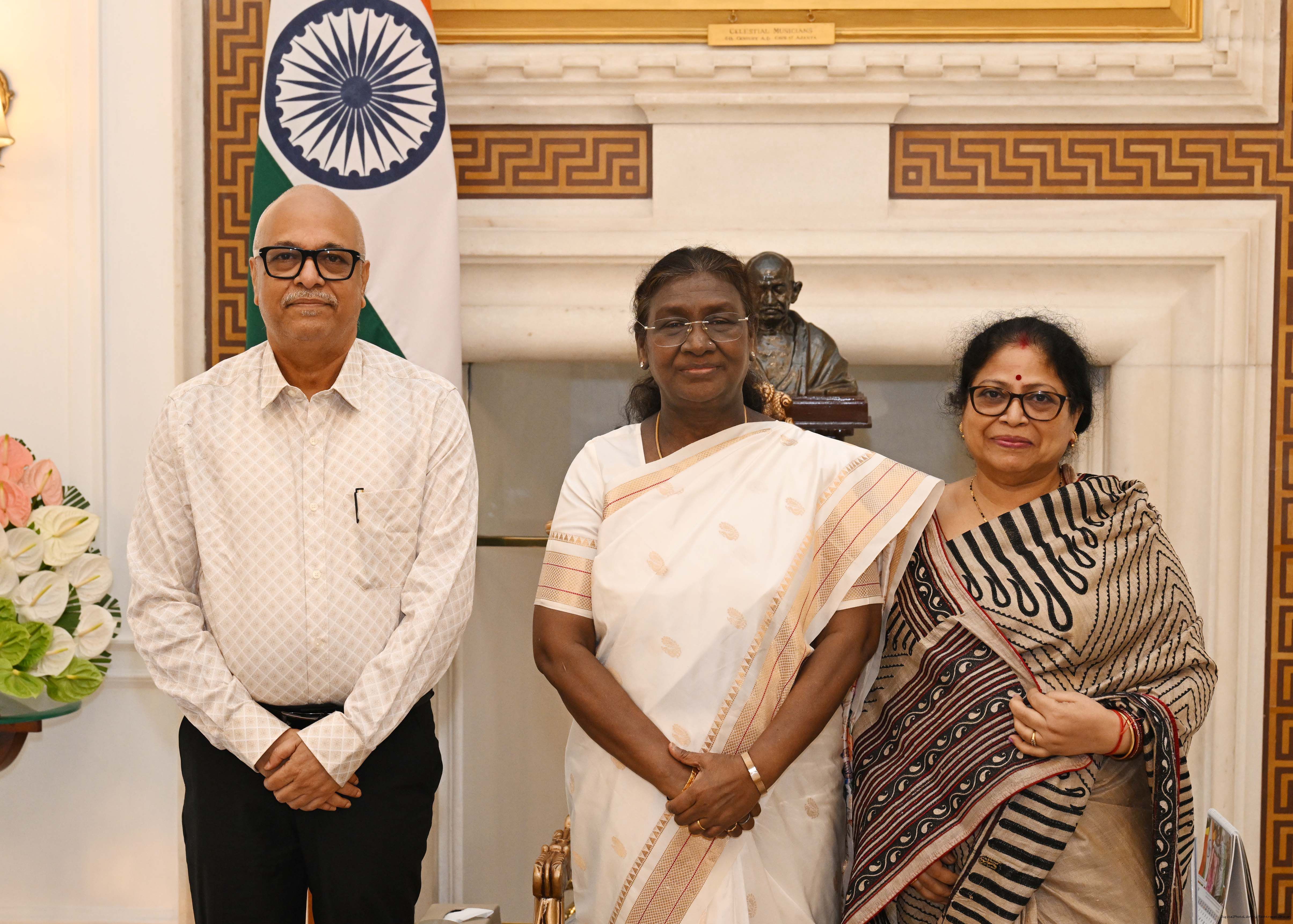 Shri Neeraj Gupta, President, Delhi Art Society along with Smt. Preeti Gupta meeting with the President of India, Smt Droupadi Murmu at Rashtrapati Bhavan on August 13, 2025.