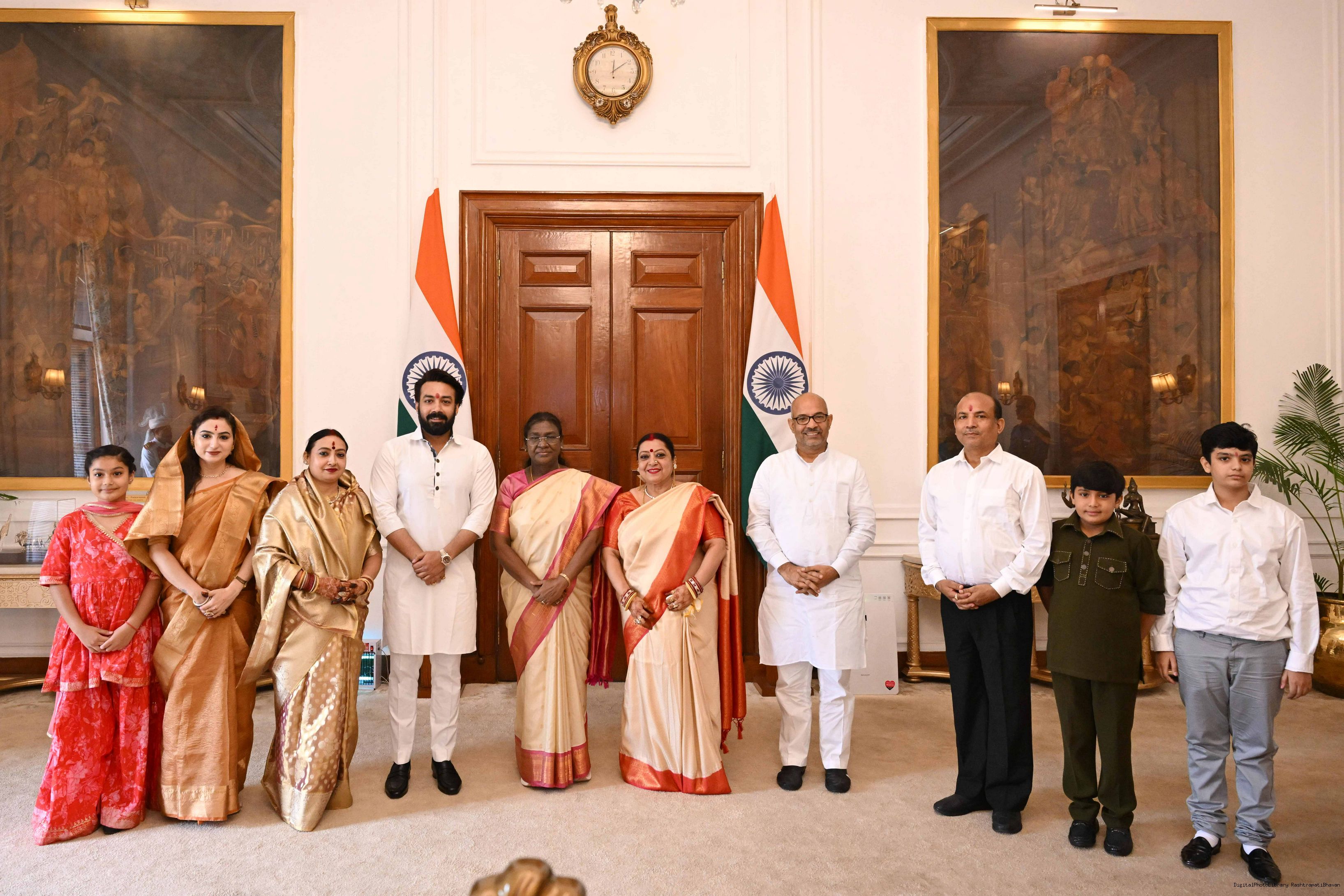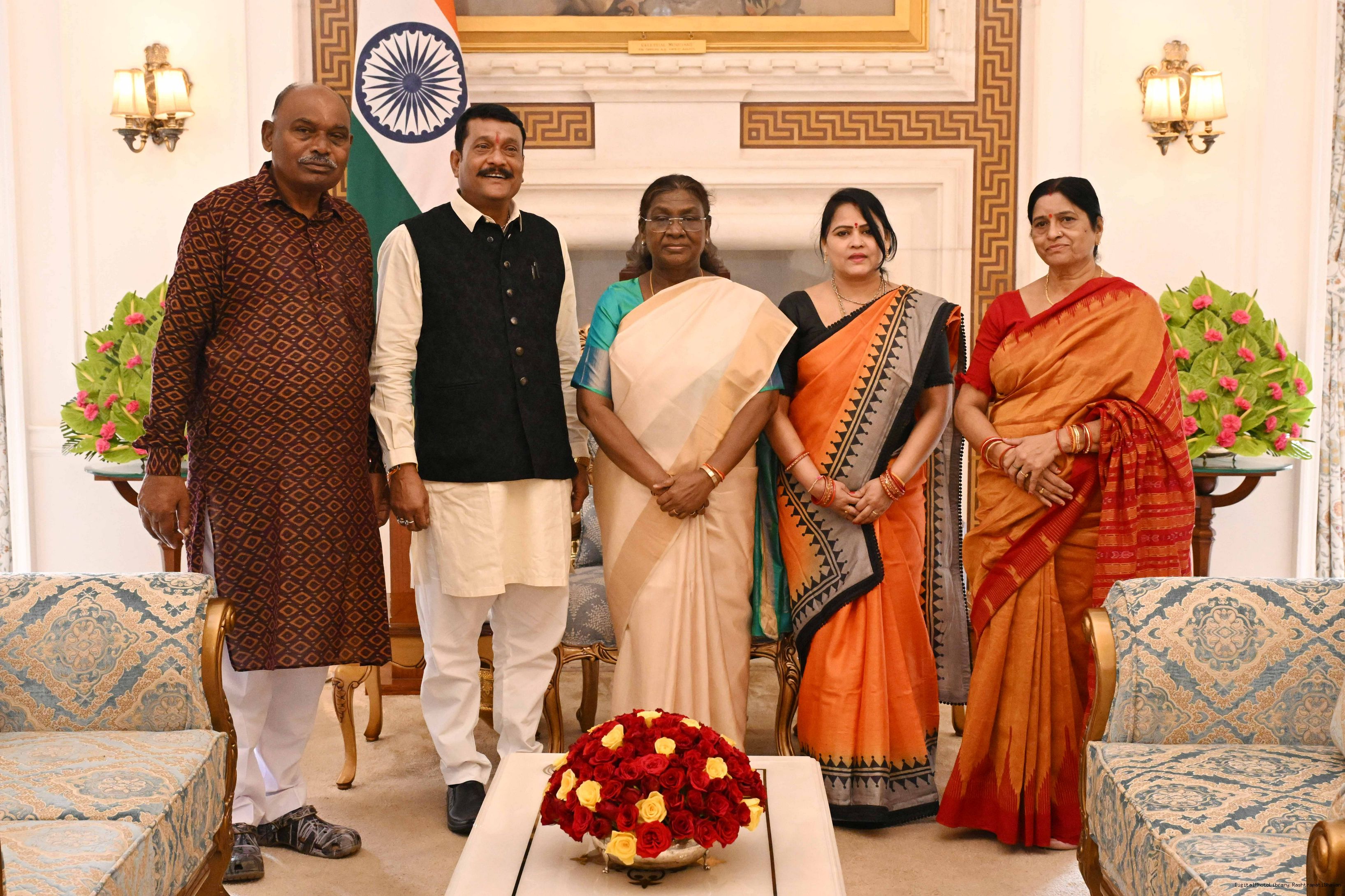 Shri Kamlesh Paswan, MoS for Rural Development, GoI along with mother and others meeting with the President of India, Smt Droupadi Murmu at Rashtrapati Bhavan on August 18, 2025.